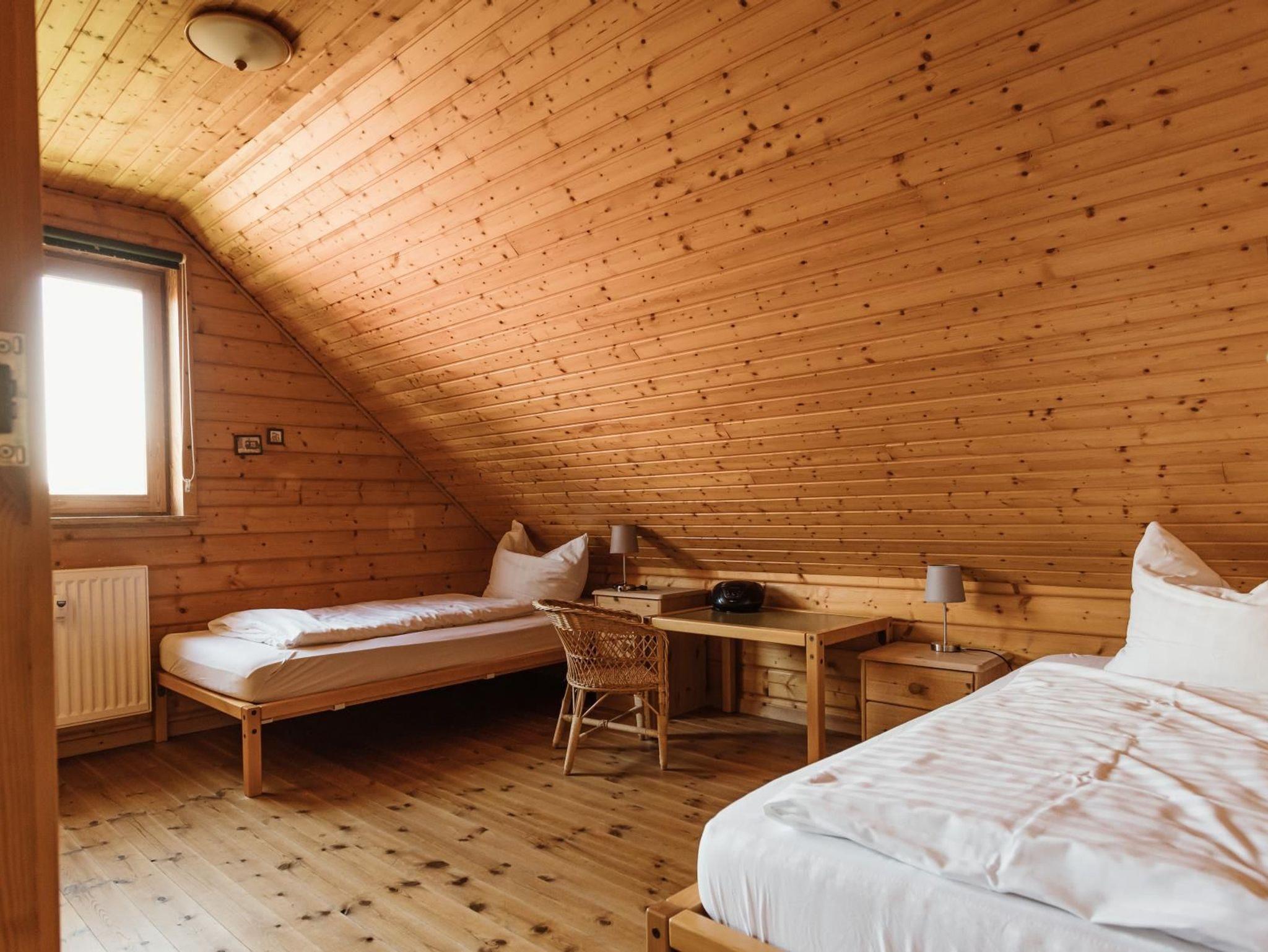 Im Dachgeschoss liegen zwei Schlafzimmer ? eines mit getrennten Betten, das andere mit einem Boxspringbett (180 x 200 cm). Bei eigener Bettwäsche ist ein entsprechend großes Laken mitzubringen. Ergänzt wird die Etage durch ein Duschbad/WC.