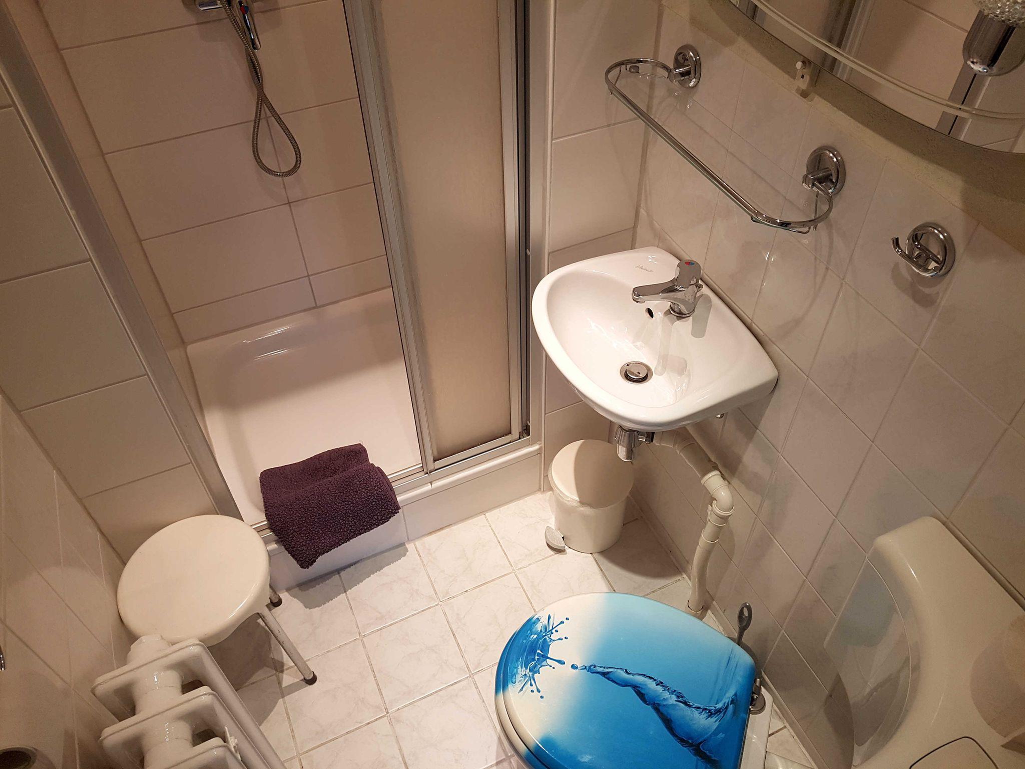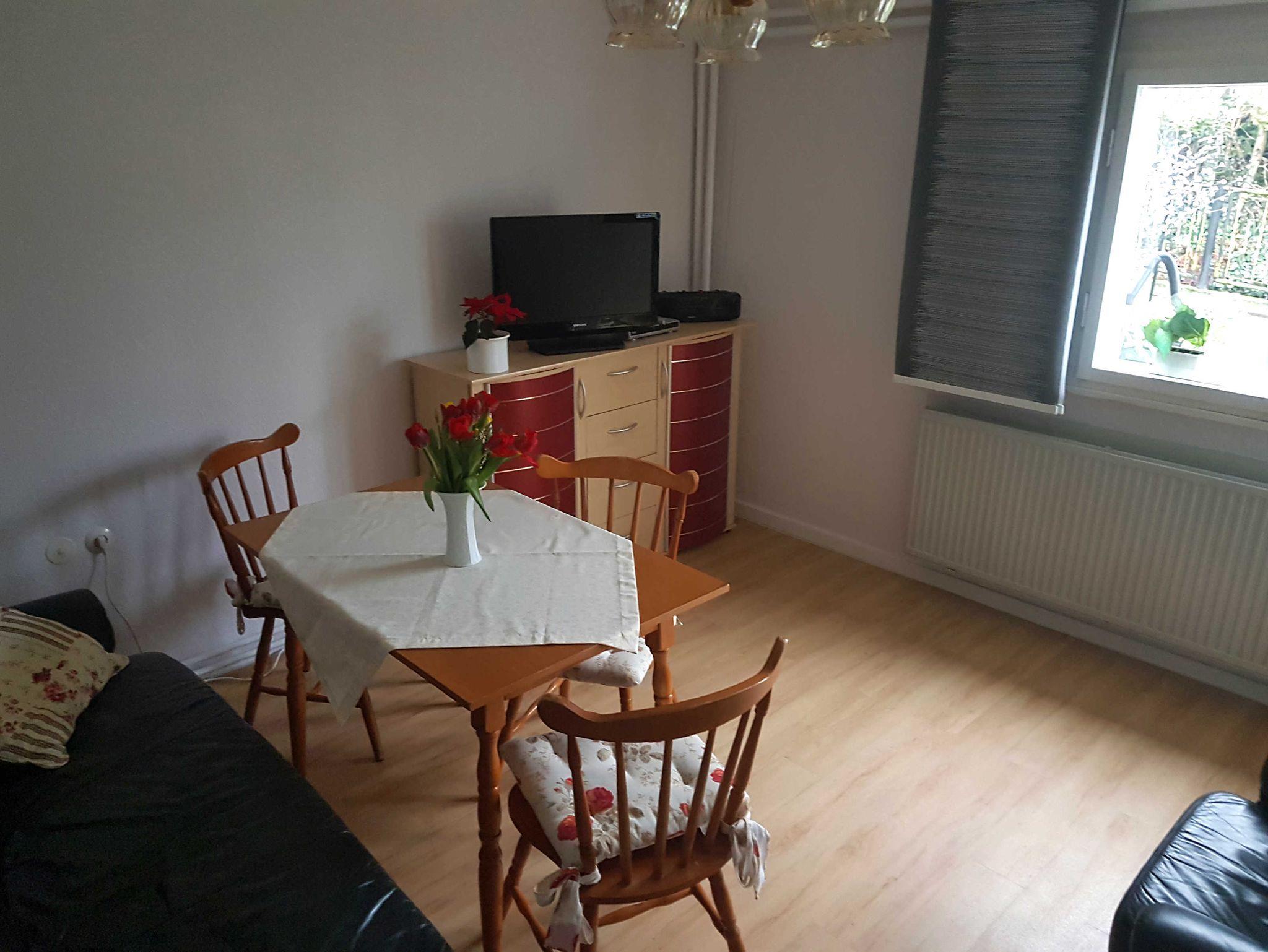 Das Wohnzimmer ist zweckentsprechend eingerichtet. Zusätzlich zum Sessel und einem Sofa befindet sich in der Mitte des Raumes ein Tisch mit 3 Stühlen, wo gemütlich selbst gefertigte Mahlzeiten eingenommen werden können. Die kleine Kochnische mit einer Koch- und Kühlkombination und integrierter Spüle sorgt für eine ausreichende Selbstversorgung. Kaffeemaschine und Toaster sind vorhanden.