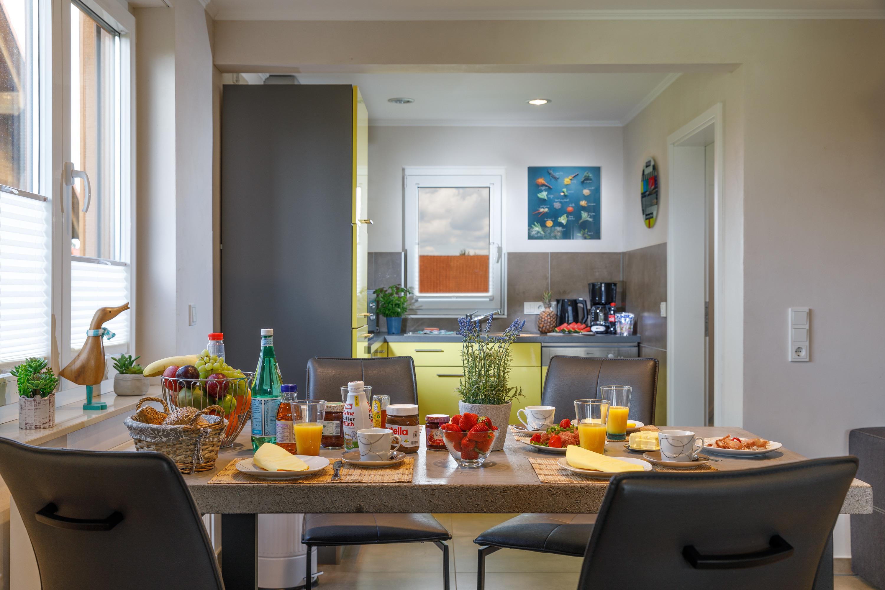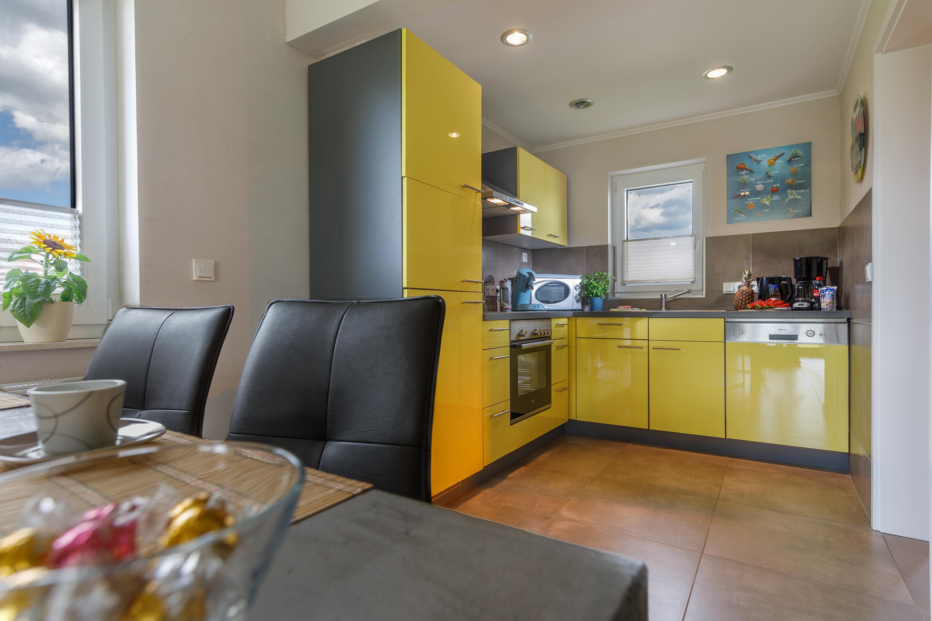 mit Geschirrspüler, Ceranherd mit Backofen, Mikrowelle, Kühl-/Gefrierkombination, Toaster, Kaffeemaschine, Padmaschine und vielem mehr.