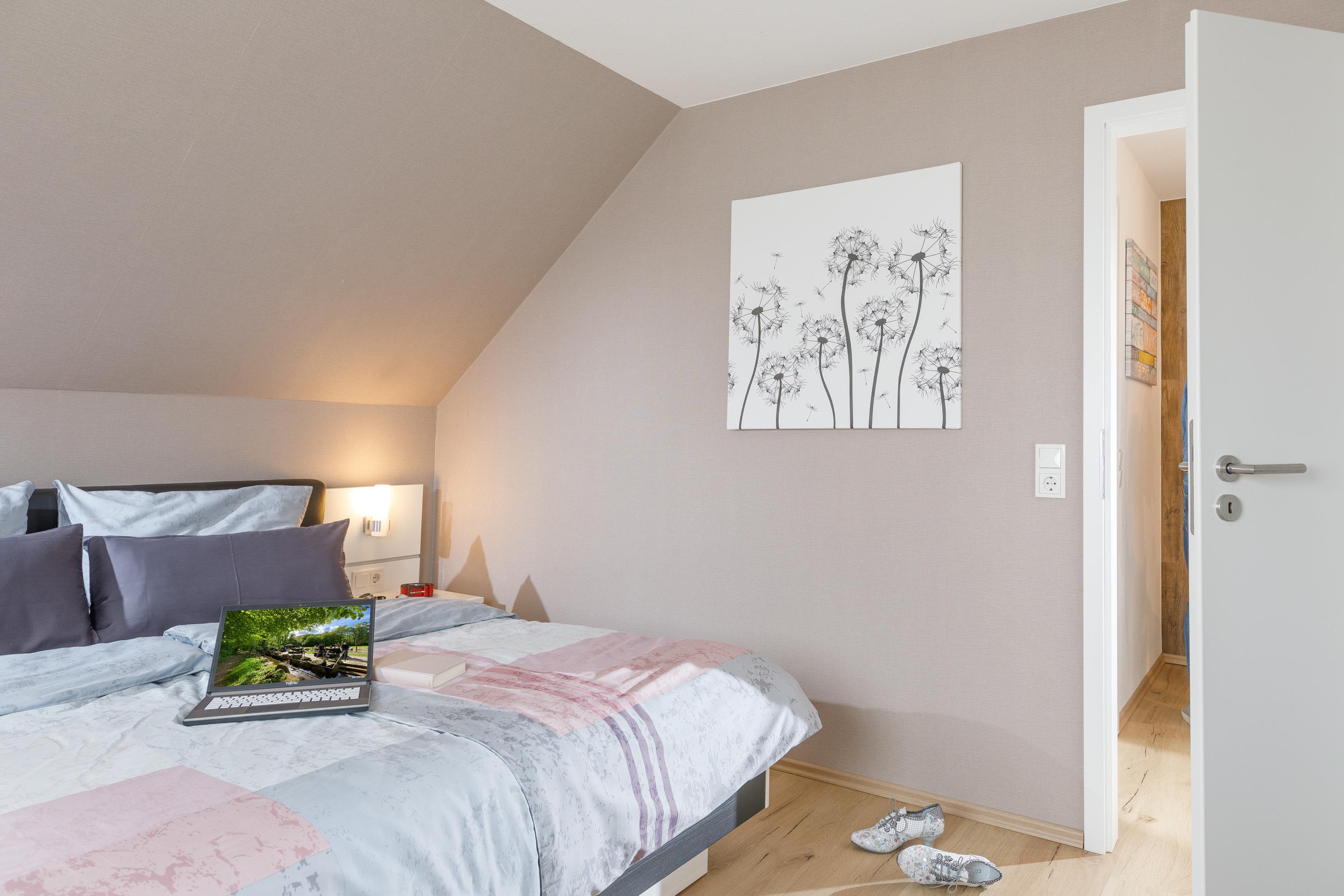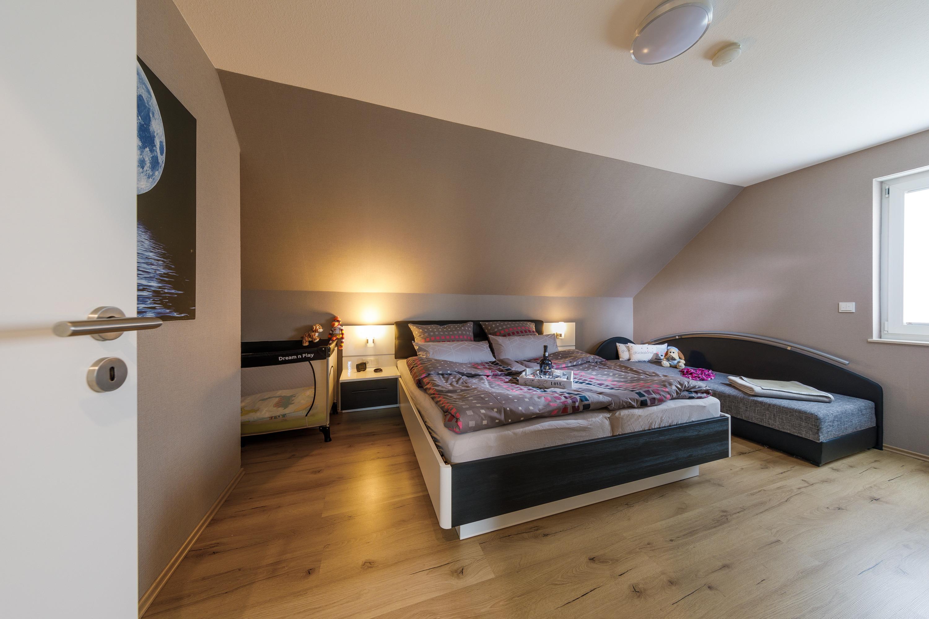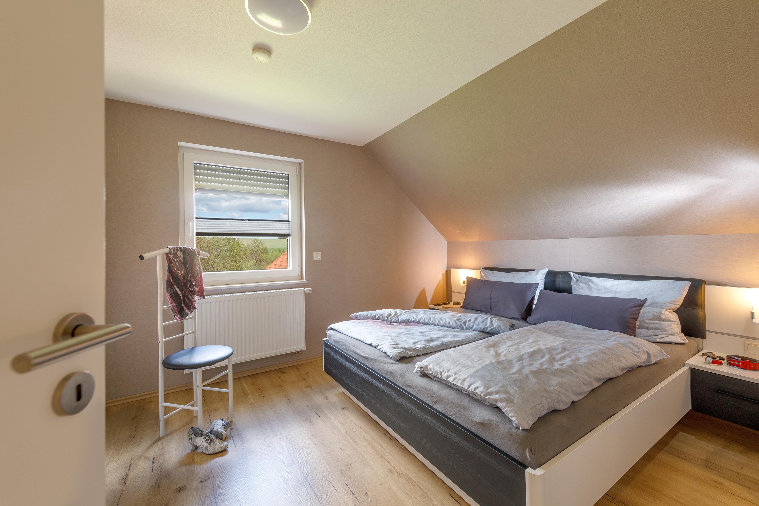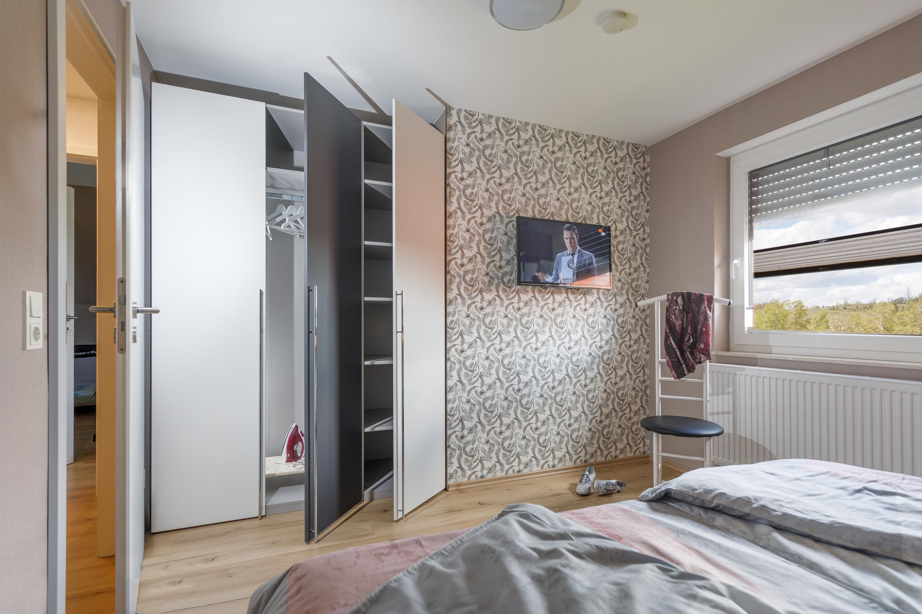 Doppelbett, zusätzliche Aufbettungsmöglichkeit, Kleiderschrank.