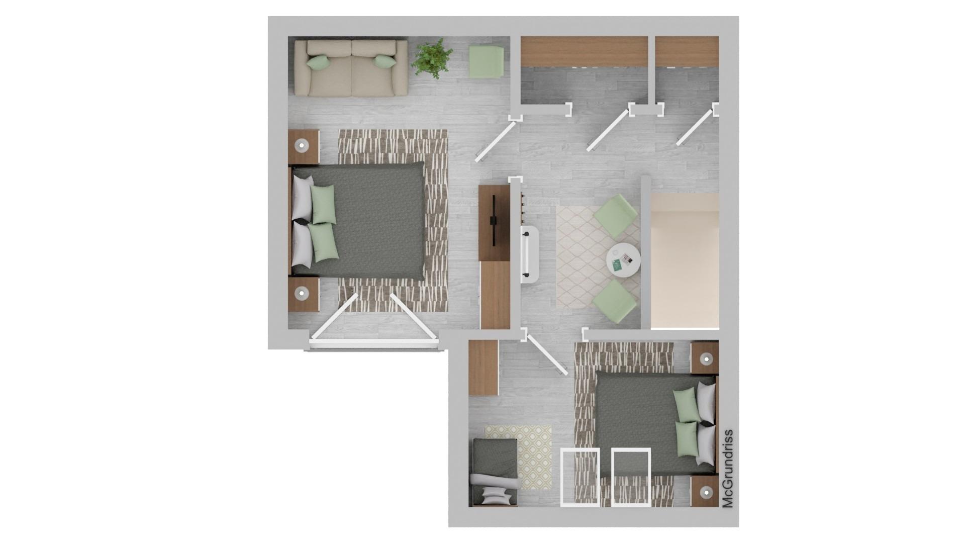 - kleines Schlafzimmer mit einem Doppelbett und großem Schrank