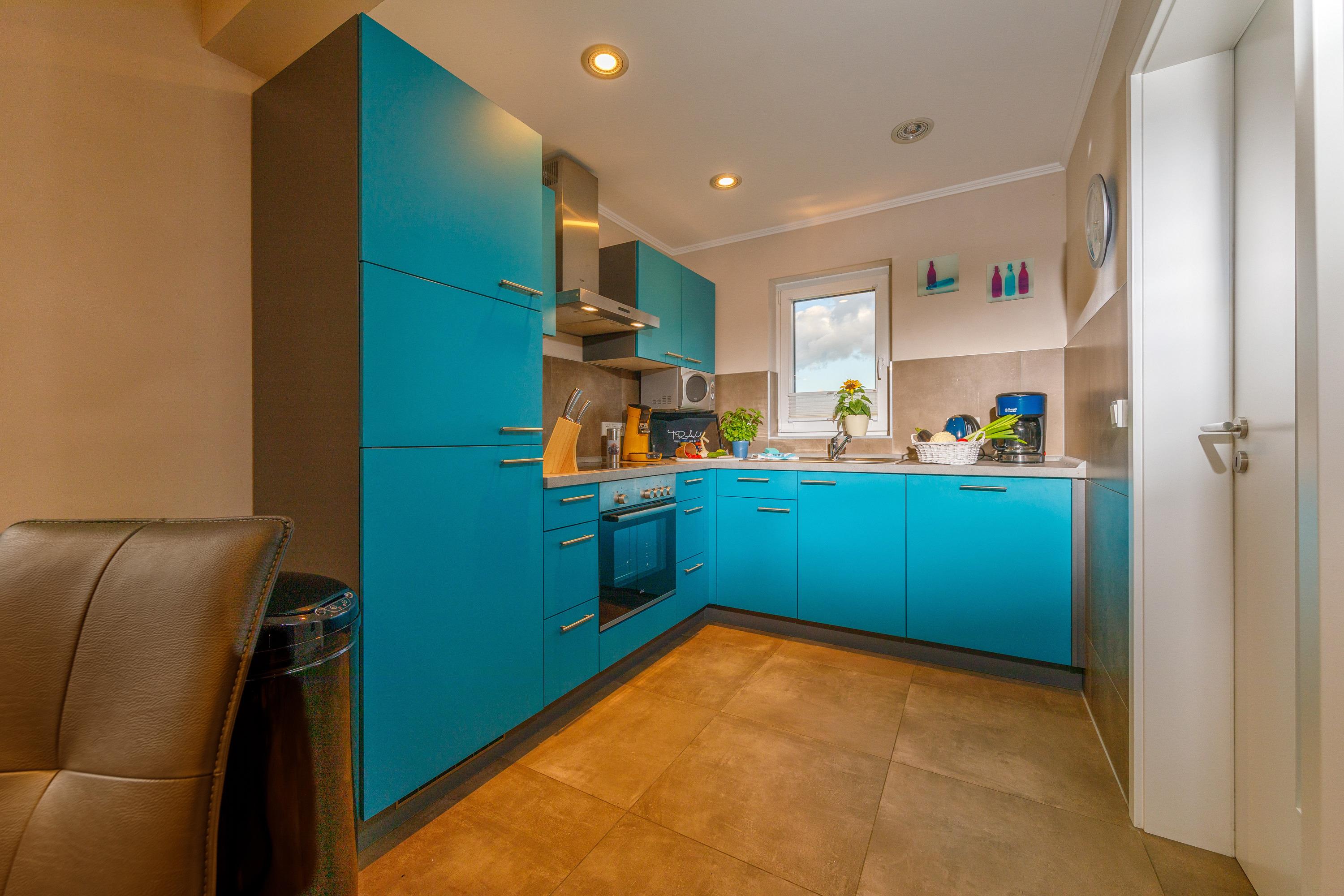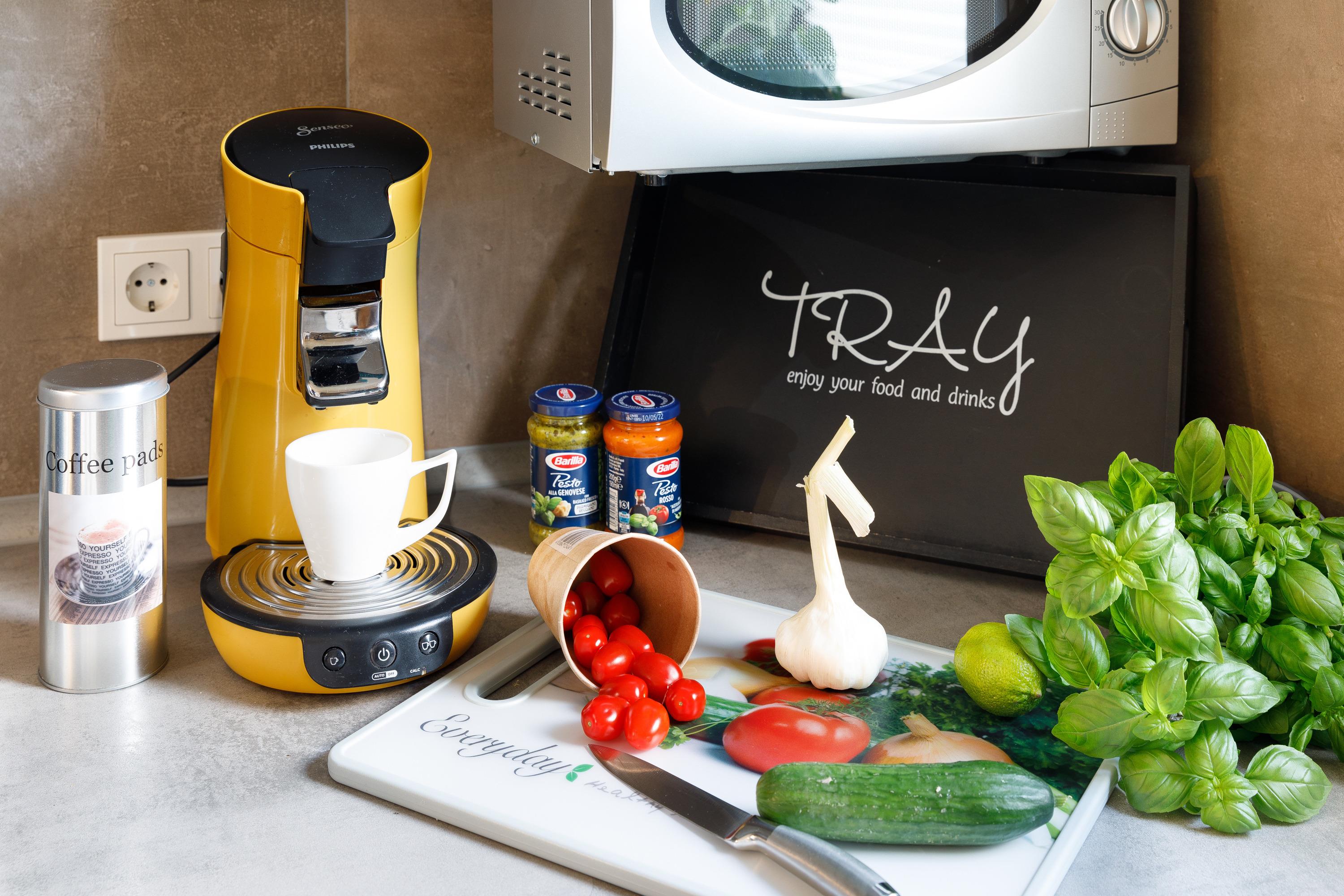 mit Geschirrspüler, Ceranherd mit Backofen, Mikrowelle, Kühl-/Gefrierkombination, Toaster, Kaffeemaschine, Padmaschine und vielem mehr.