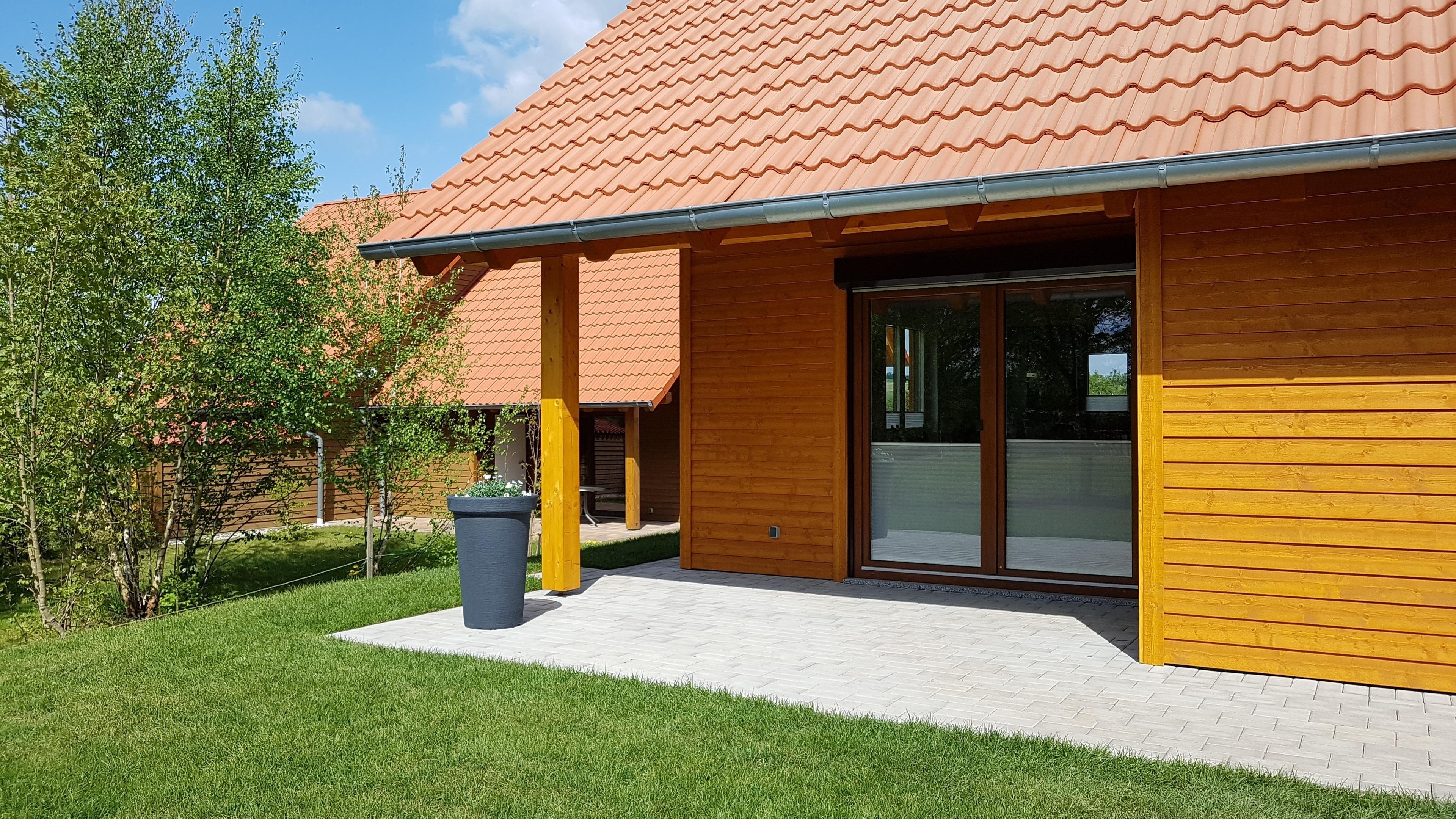 • Teilüberdachte Terrasse mit angrenzender Rasenfläche.