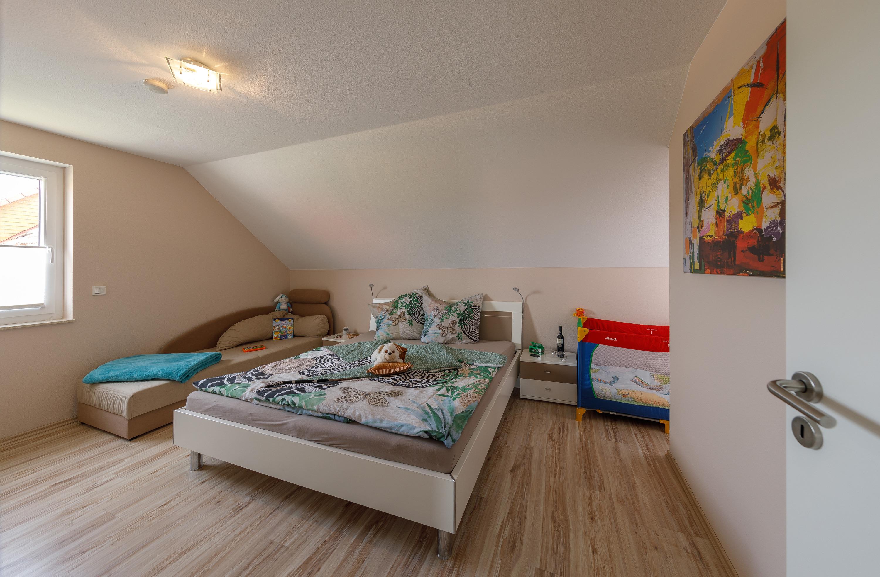 Doppelbett, zusätzliche Aufbettungsmöglichkeit, Kleiderschrank.