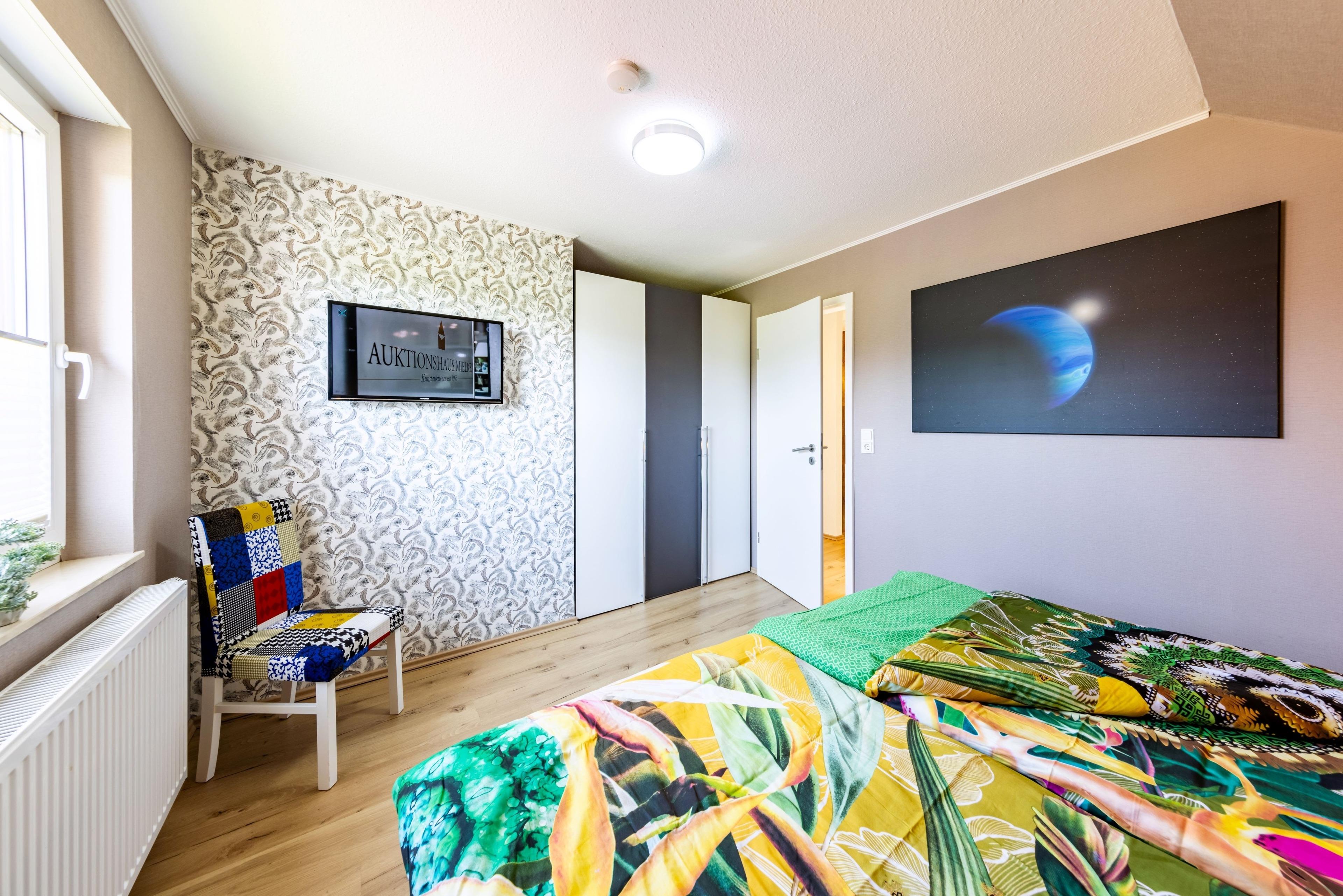 Doppelbett, Kleiderschrank, SAT-TV.