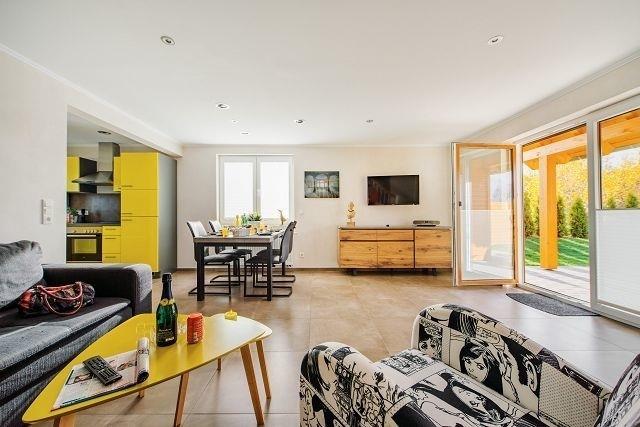mit Schlafcouch (für 1–2 Personen), Fußbodenheizung, Flachbild-TV und virtuellem Kamin.