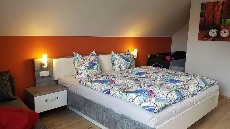 Doppelbett, zusätzliche Aufbettungsmöglichkeit, Kleiderschrank.