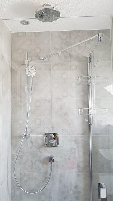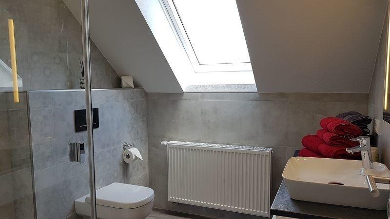 mit ebenerdiger Regendusche und Föhn.