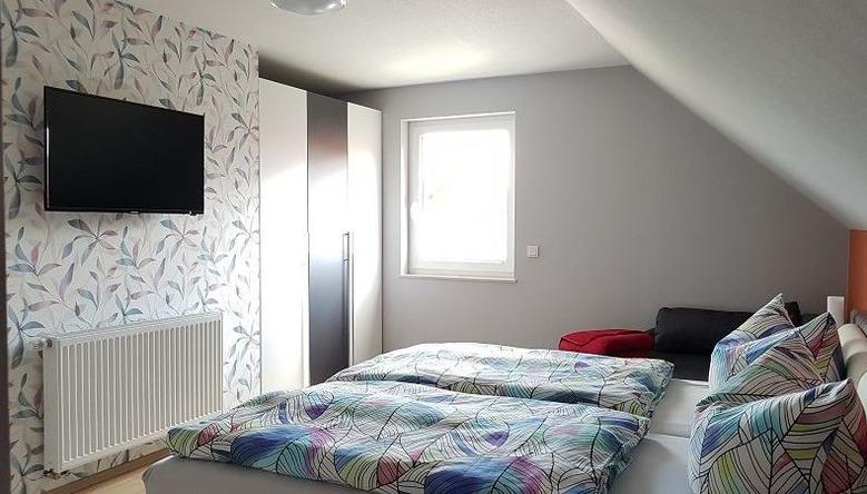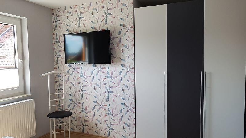 Doppelbett, Kleiderschrank, SAT-TV.