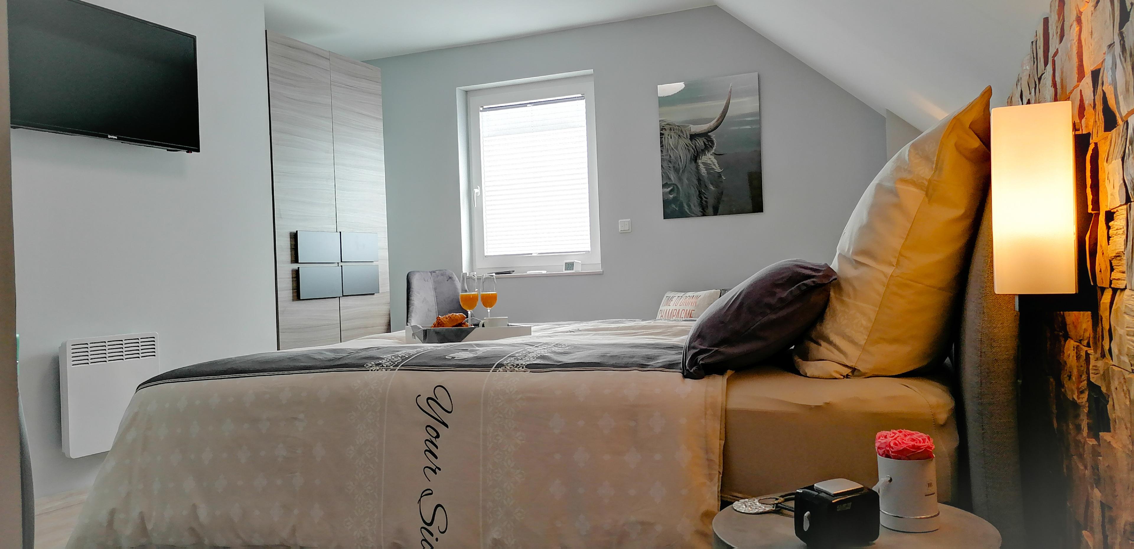 1 Schlafzimmer mit Doppelbett- Boxspringbett, Kleiderschrank, SAT- TV