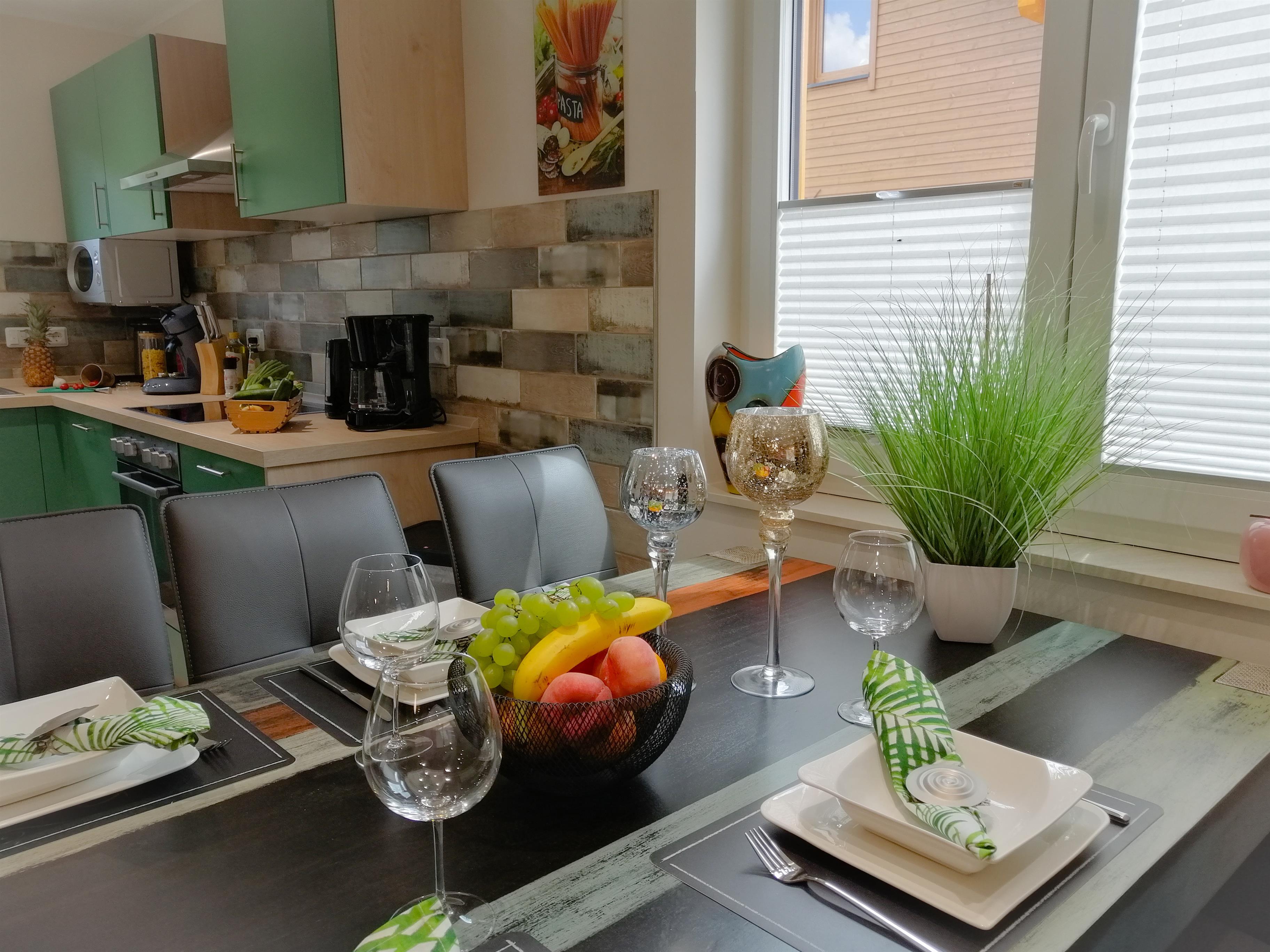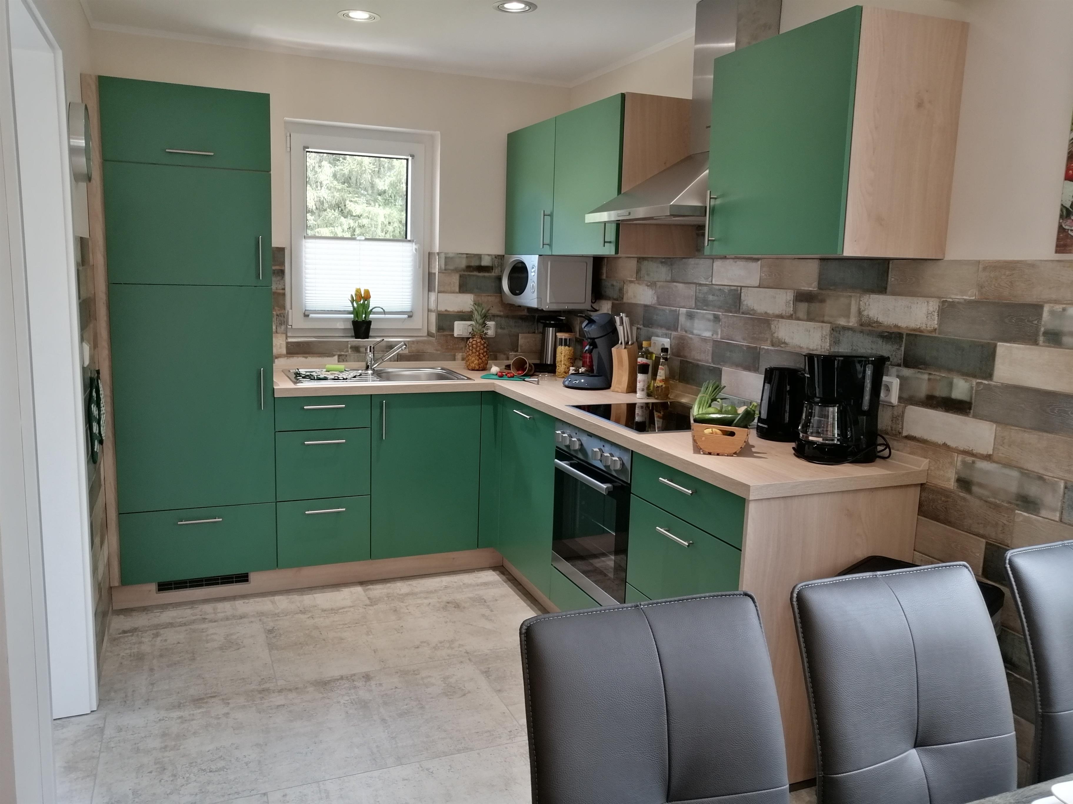 1 moderne vollausgestattete Küche mit Geschirrspüler, Mikrowelle, E-Herd (Ceran) mit Backofen, Kühl-/ Gefrierkombination, Toaster, Kaffeemaschine, Padmaschine, Mikrowelle u.v.m.