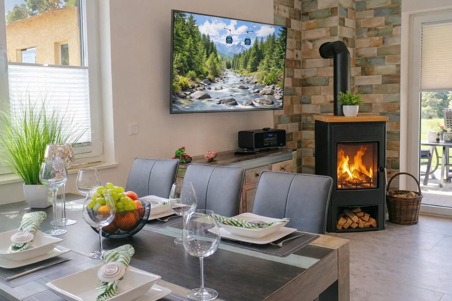 1 Wohn- / Essbereich mit Schlafcouch (für 1 - 2 Personen) mit Fußbodenheizung , Holzofen-Kamin, großen Flachbildschirm