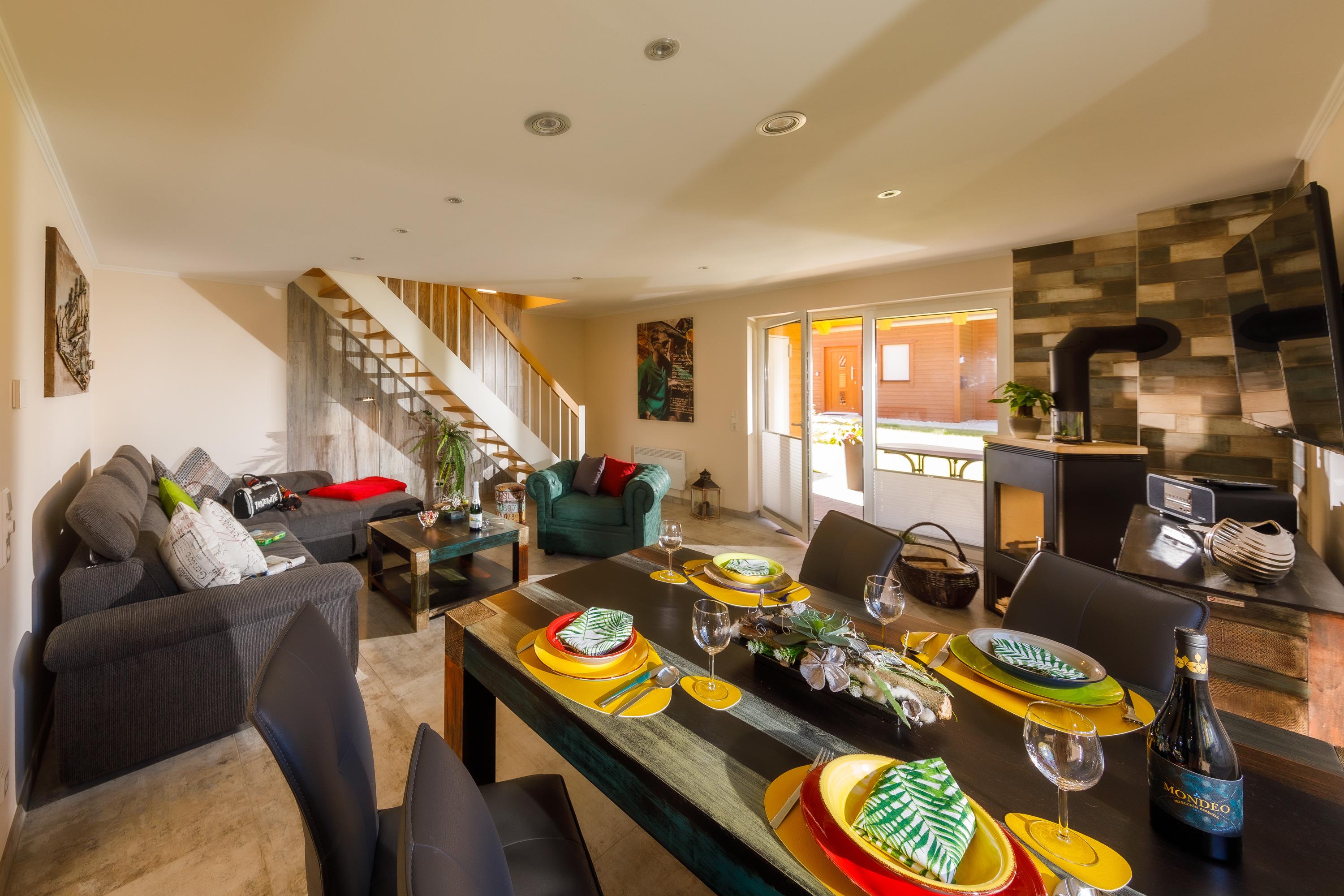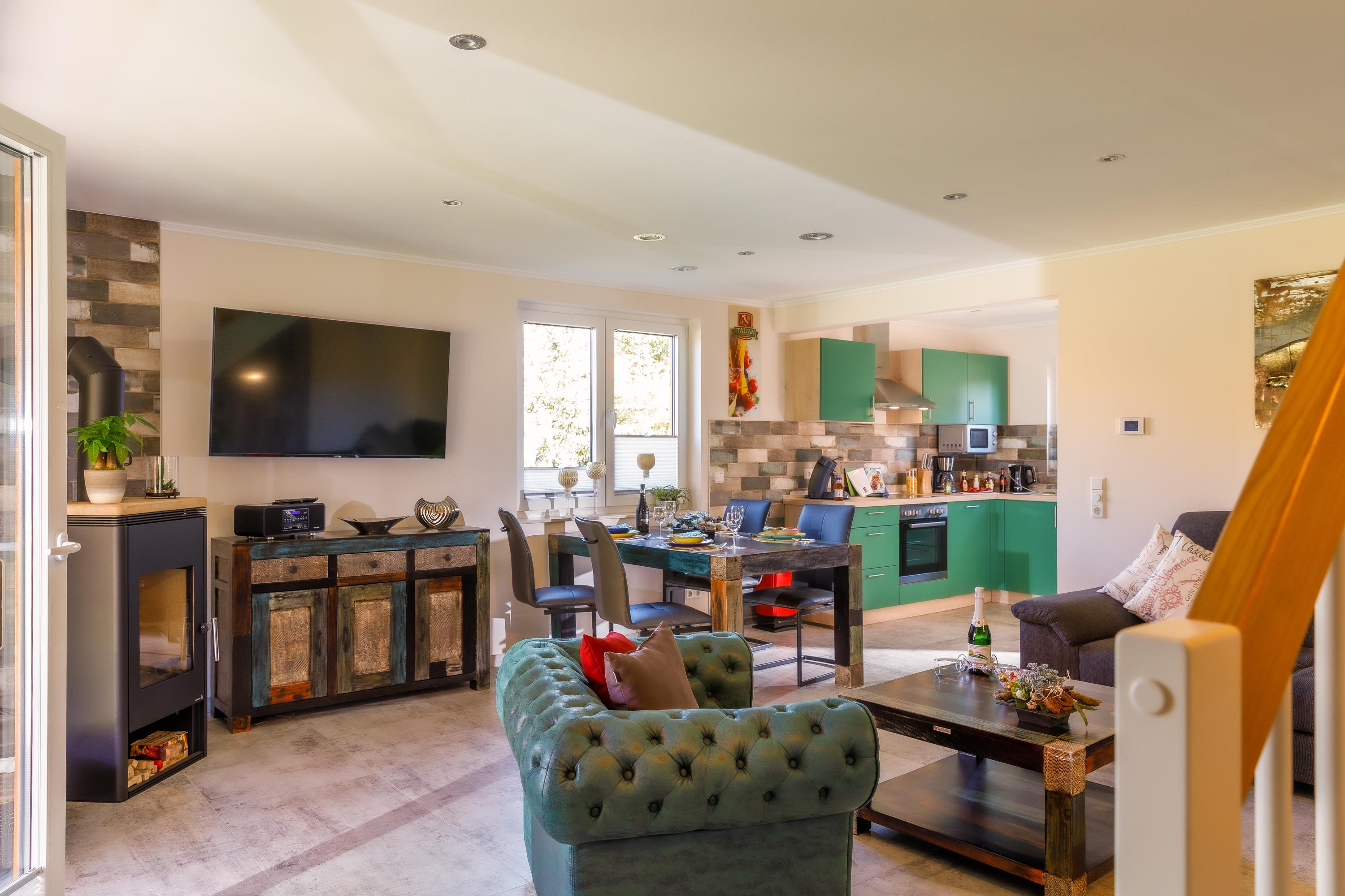 1 Wohn- / Essbereich mit Schlafcouch (für 1 - 2 Personen) mit Fußbodenheizung , Holzofen-Kamin, großen Flachbildschirm