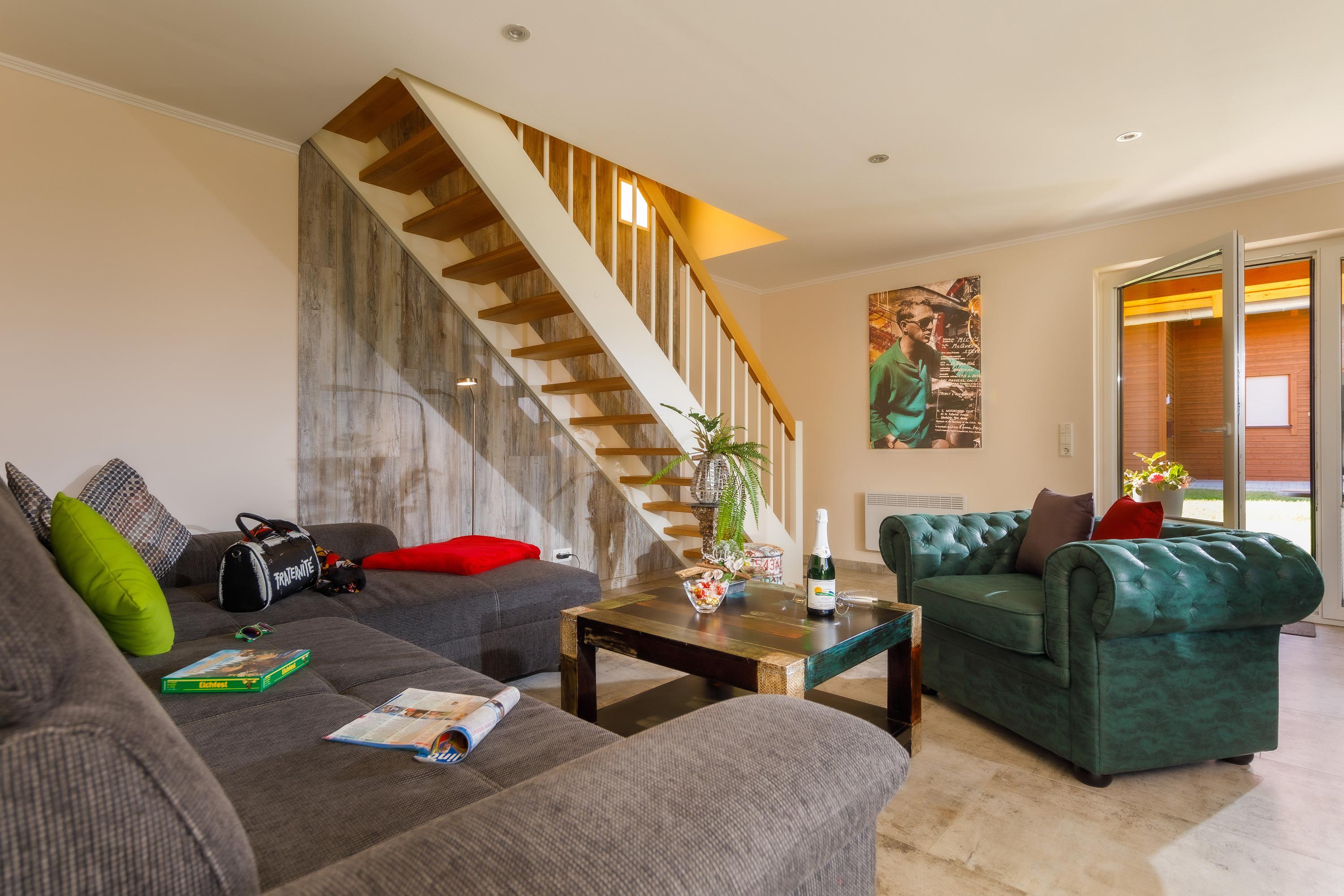 1 Wohn- / Essbereich mit Schlafcouch (für 1 - 2 Personen) mit Fußbodenheizung, Holzofen-Kamin, großen Flachbildschirm