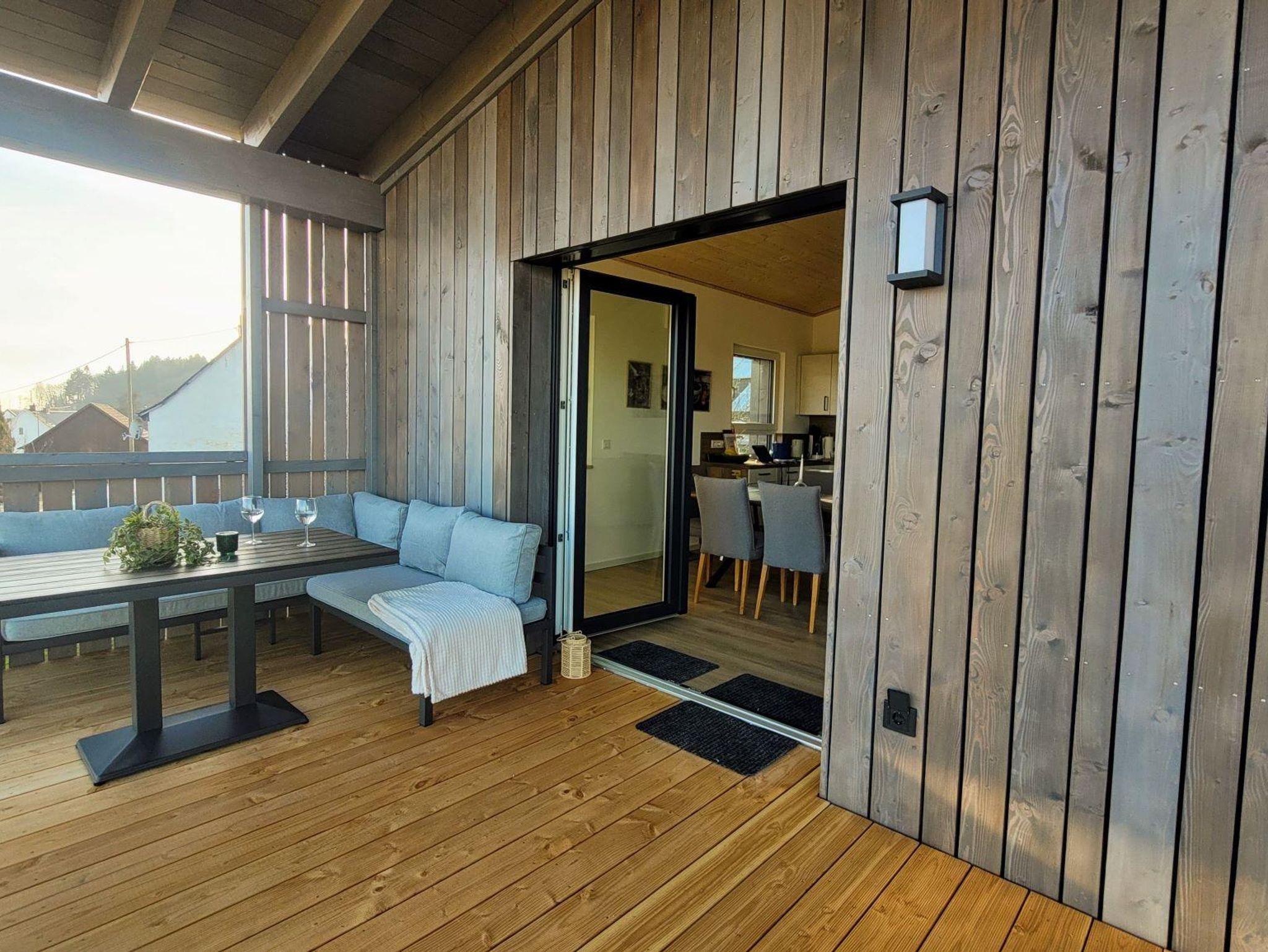 Ein besonderes Highlight der Wohnung ist der 25 qm große, überdachte Holz Balkon, der auf der Südseite des Hauses einen wunderschönen Panoramablick auf die umliegende Natur bietet. Auf der Eingangsseite vor der Haustür befindet sich eine Holz Veranda auf der man die Abendsonne genießen kann.