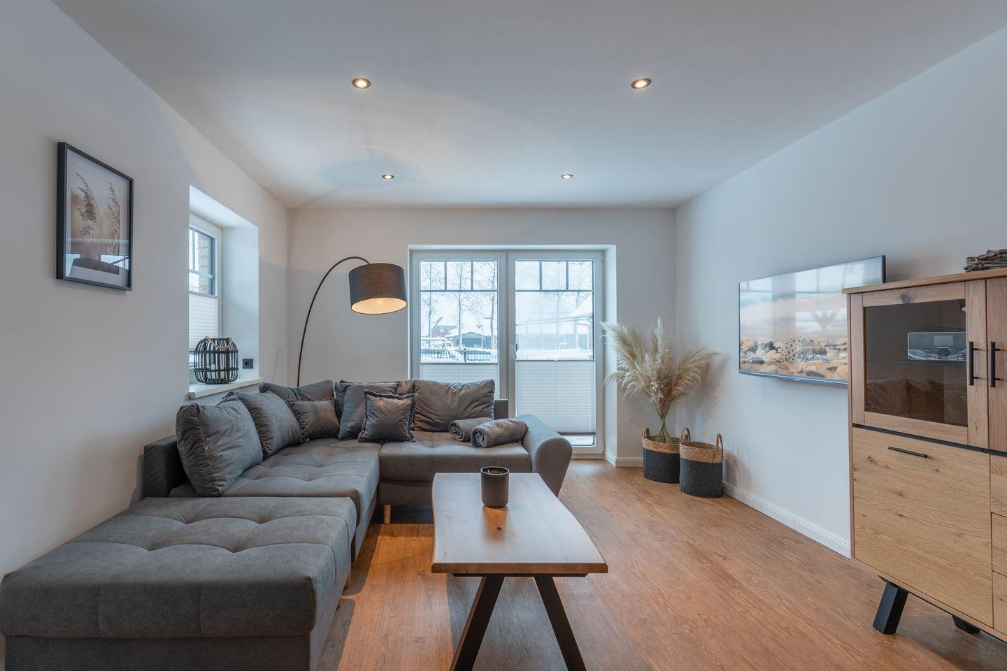 Die stilvoll und komfortabel eingerichtete Ferienwohnung ist gut 80 qm groß. Sie bietet ein geräumiges Wohnzimmer mit Flachbild-TV (SAT) und Sofaecke. Die offene Küche mit dem großen Esstisch ist mit einem Herd (Ceranfeld), Backofen, Geschirrspülmaschine und Kühlschrank, Toaster, Wasserkocher und Filterkaffeemaschine ausgestattet. In einem separaten Hauswirtschaftsraum stehen Ihnen Waschmaschine und Trockner zur Verfügung. Das Apartment verfügt über zwei Schlafzimmer (180 x 200 und 2x 90 x 200). Ein Hightlight ist das Duschbad mit Regendusche, Schwallbrause und Sauna.