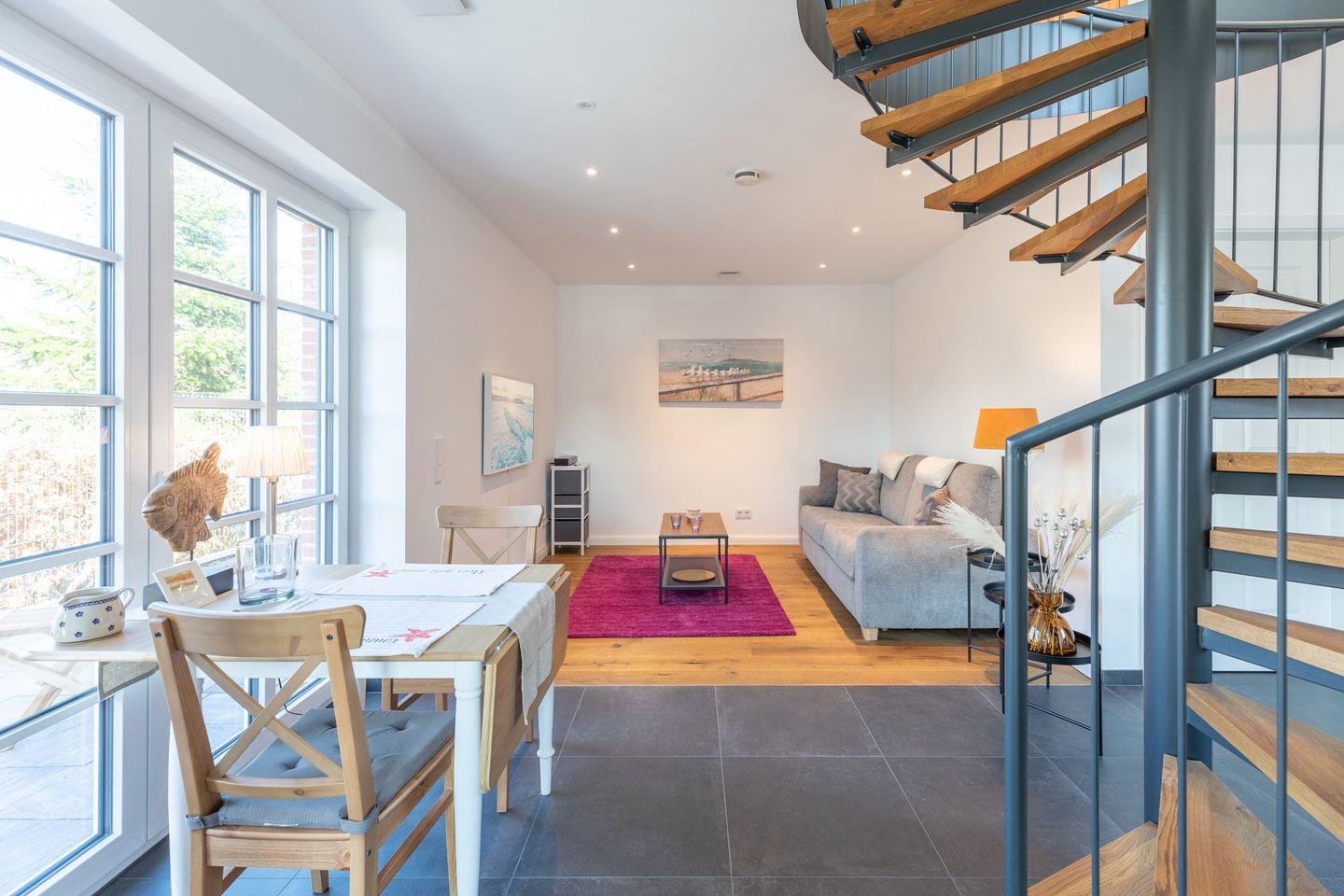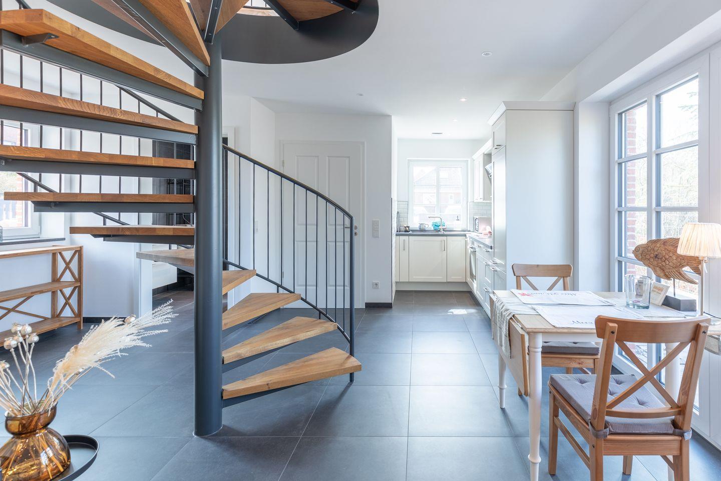 Die ca. 74 qm große Ferienwohnung ist mit allem eingerichtet, was Sie für einen erholsamen Urlaub benötigen. Die offene Küche ist mit Herd (Cerankochfeld), Backofen, Geschirrspüler & Kühlschrank, Toaster, Wasserkocher und Filterkaffeemaschine ausgestattet. Das lichtdurchflutete Wohnzimmer mit Flachbildfernseher und Sofaecke lädt zum gemütlichen Beisammensein ein. Über eine Wendeltreppe gelangen Sie ins 1. Obergeschoss zum geräumigen Schlafzimmer mit einem Doppelbett (180 x 200) und einem großen Bad mit bodengleicher Dusche. Neben der Gästetoilette im Erdgeschoss befindet sich darüber hinaus eine Waschmaschine in einem separaten Abstellraum.