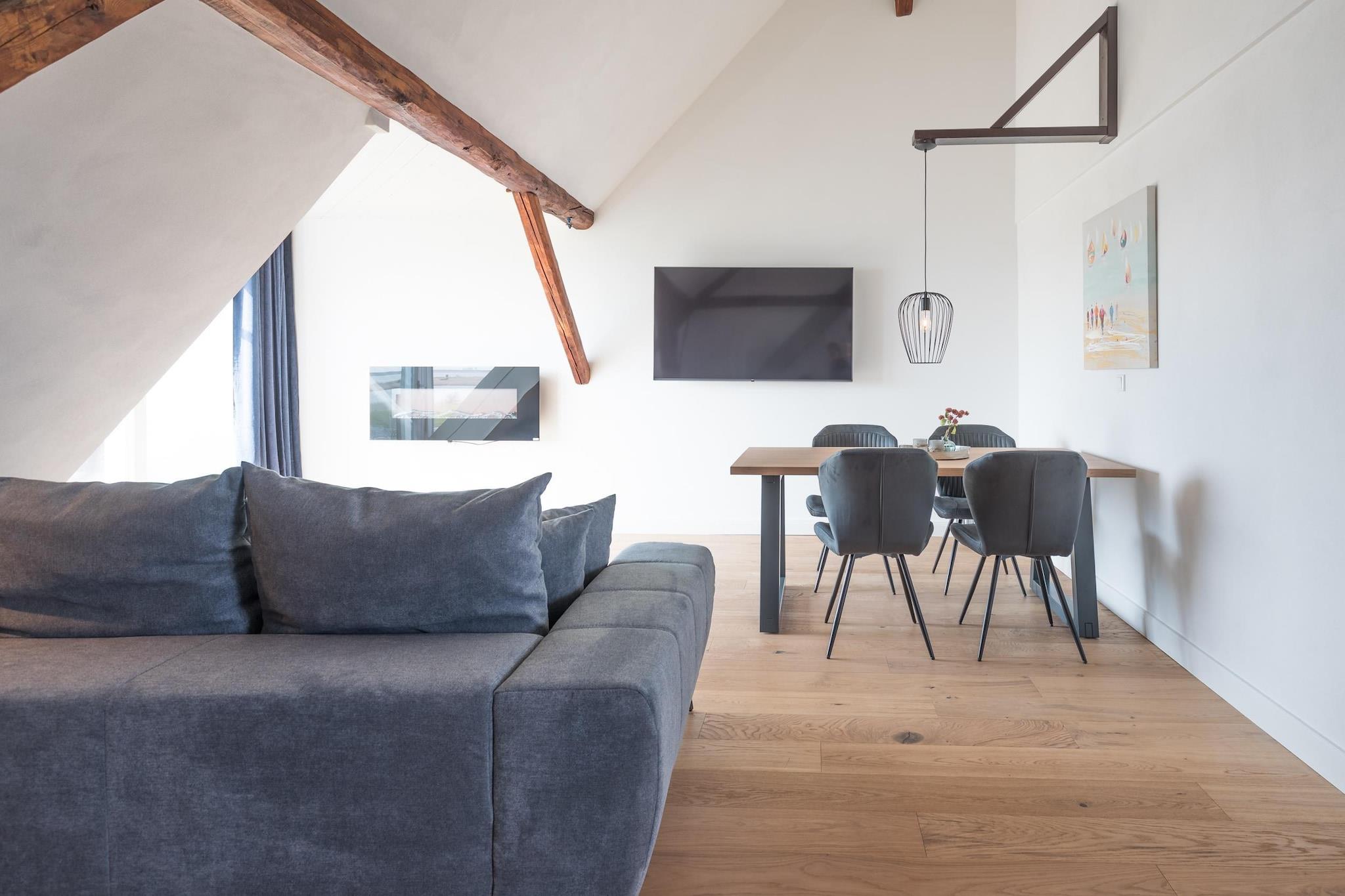 Den historiske Arlau-slusen: Nyt tiden ute med den uforlignelige utsikten over Beltringharder Koog naturreservat. Leiligheten er innebygd i det nordfrisiske myrlandskapet, rett ved nasjonalparken Vadehavet og verdensarvstedet. Det ligger rett ved Beltringharder Koog, som først ble dekket i 1987 og nå er Schleswig-Holsteins største naturreservat på land. Tusenvis av gjess, ender og fugler møtes her, et ekte naturskue! Og du kan se den direkte fra stuevinduet eller fra den elegante terrassen din. Det er kun 5 km til neste badeplass på den grønne ytterdiken med en liten restaurant. De sjarmerende omgivelsene kan perfekt utforskes på sykkel. Foran døren de nordfrisiske øyene og Halligen, som kan utforskes med Halligfahrt og delvis med (guidet) leirfjellsvandring. Husum, "den grå byen ved havet" Theodor Storms, Schleswig, Flensburg, Kongeriket Danmark og mange andre verdifulle destinasjoner kan lett nås. Høydepunkter inkludert: alle bruksbaserte energikostnader, WiFi, sluttrengjøring, vaskeripakke (må bestilles), parkeringsplass