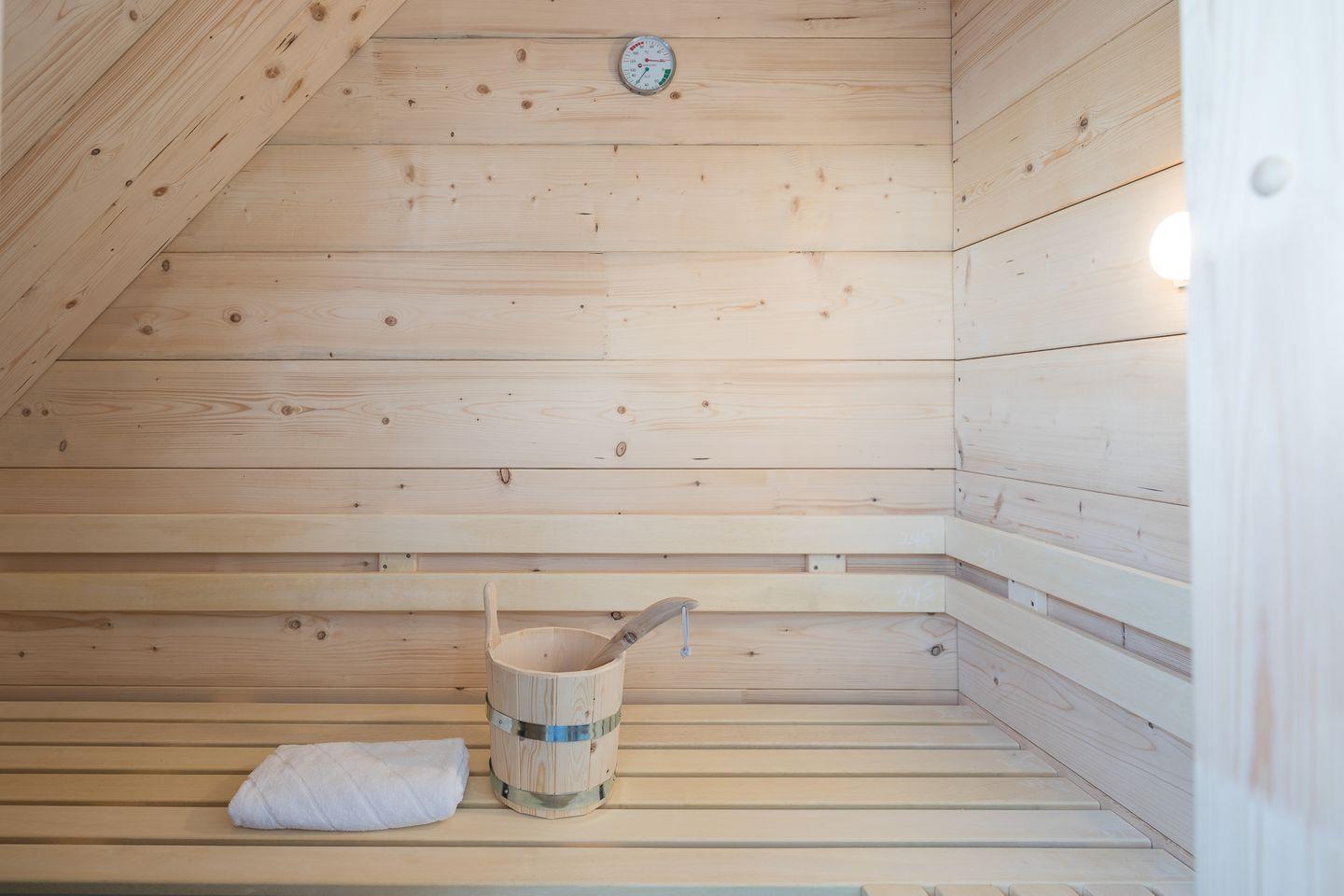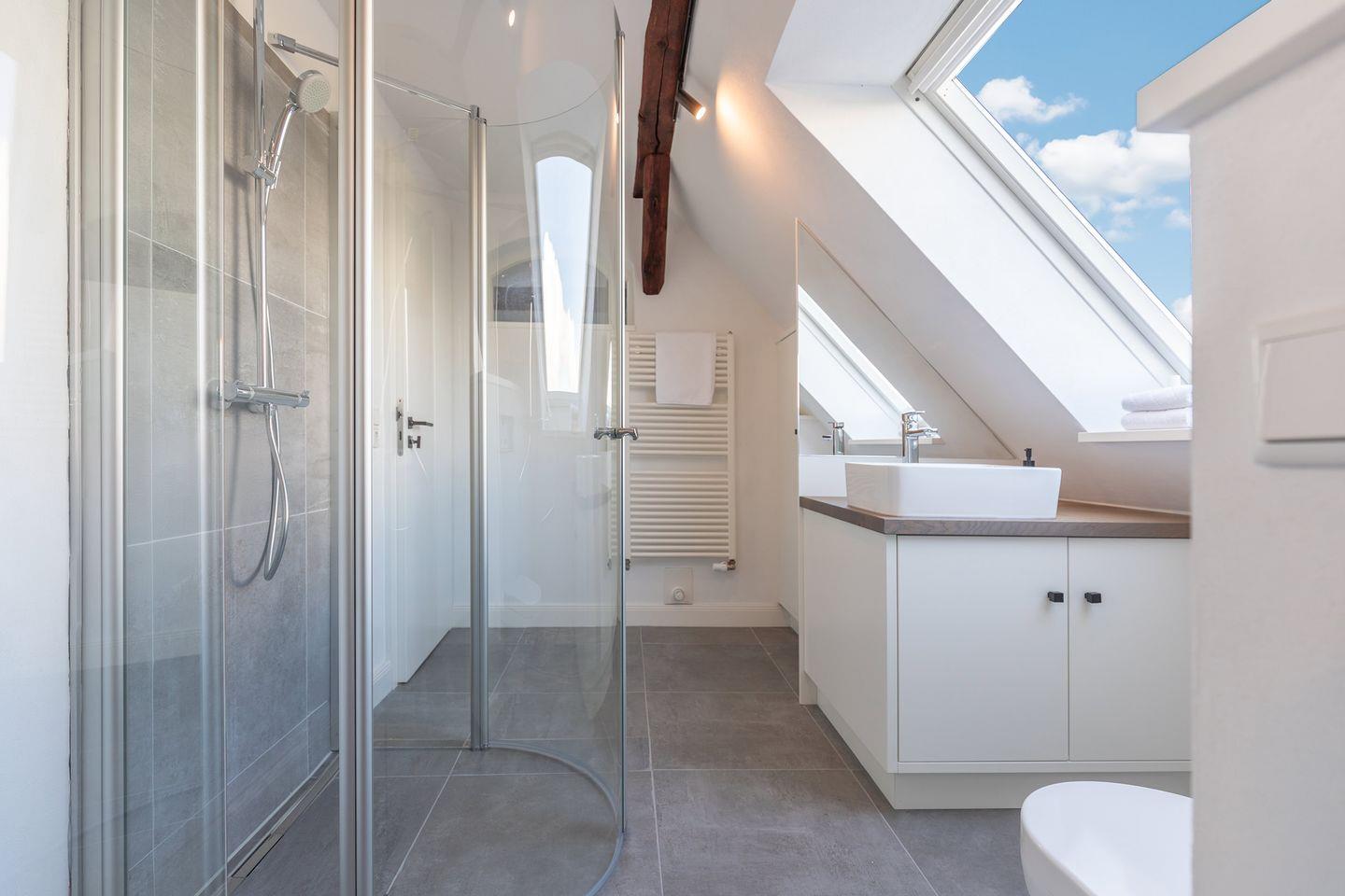 Das moderne Duschbad, von wo Sie ebenfalls einen atemberaubenden Ausblick auf die Arlau haben, wird durch eine geräumige Sauna getoppt.