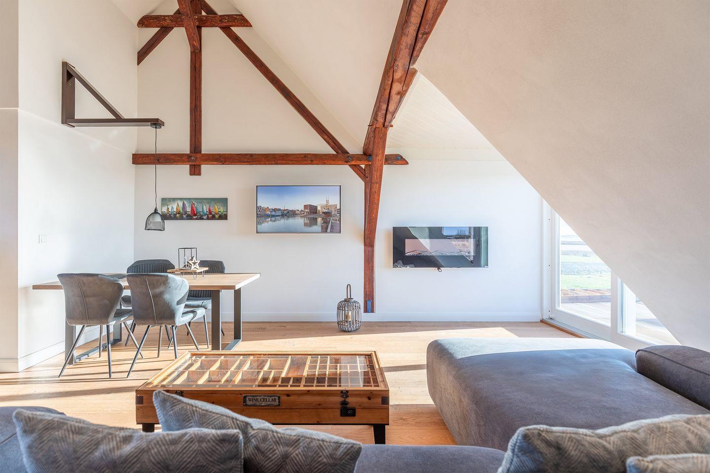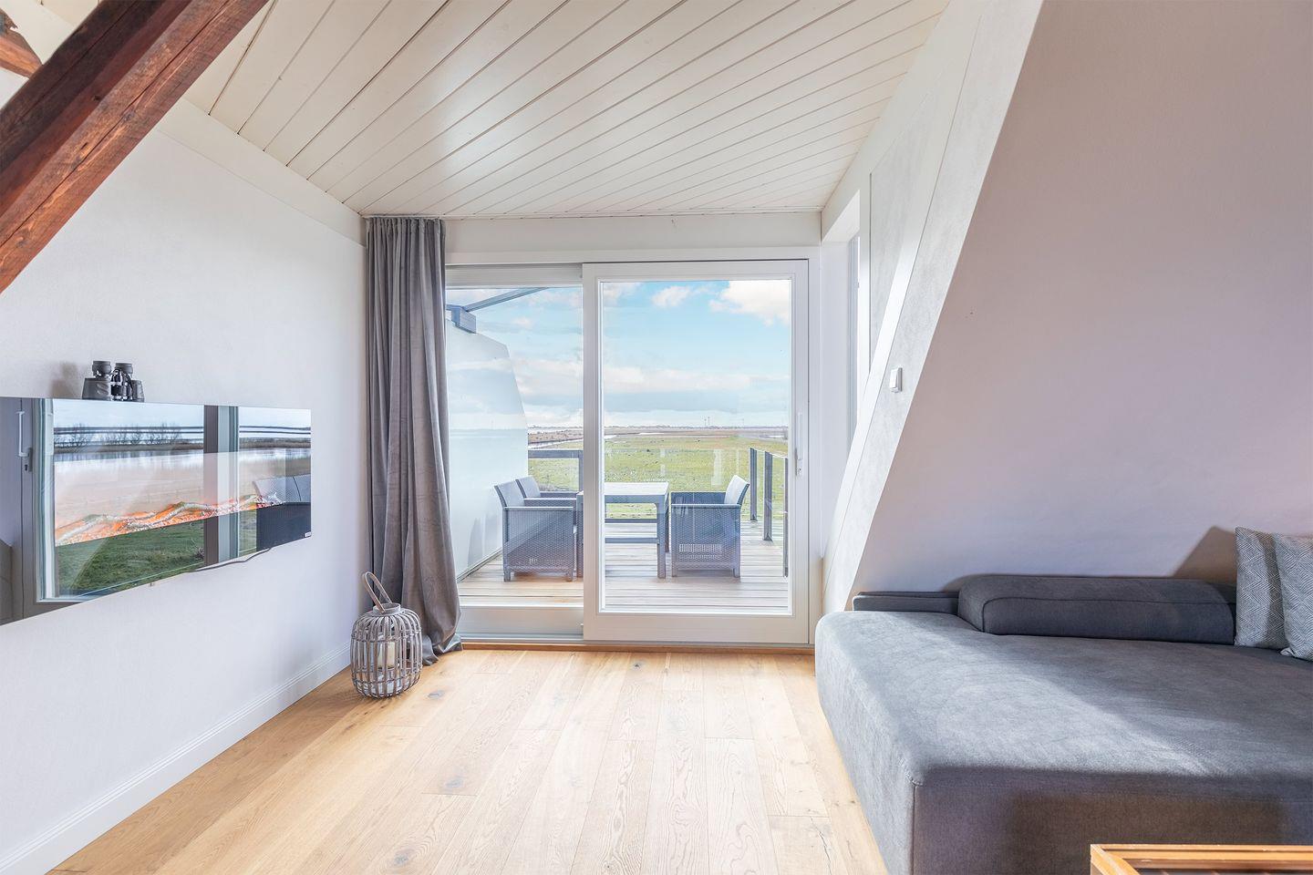 Über ein üppiges, technisch gestaltetes Treppenhaus (deich-hoch) gelangen Sie in die 90 qm große Ferienwohnung. Sie bietet Ihnen einen großzügigen, lichtdurchfluteten Wohn-Essbereich mit großem TV und Musikanlage. Genießen Sie vor dem prasselnden Elektro-Kaminofen ein spannendes Buch und schauen Sie einfach raus in die beeindruckende Landschaft. Die schönen Dielenböden geben Ihnen ein behagliches Wohngefühl.
