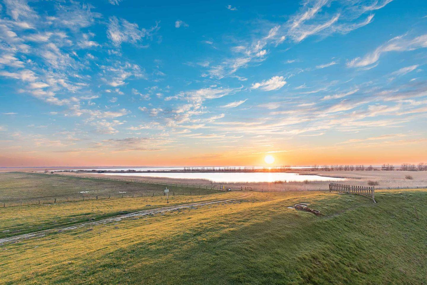 Genießen Sie die unvergesslichen Sonnenuntergänge direkt von Ihrer Terrasse aus oder im Strandkorb auf dem Deich.