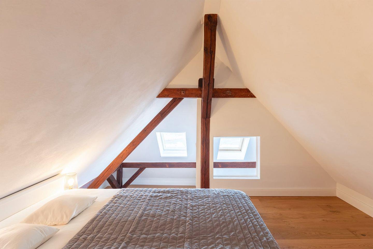 Über eine Treppe gelangen Sie auf den Spitzboden, dass mit einem Doppelbett (160 x 200) eingerichtet ist - perfekt für Kinder!