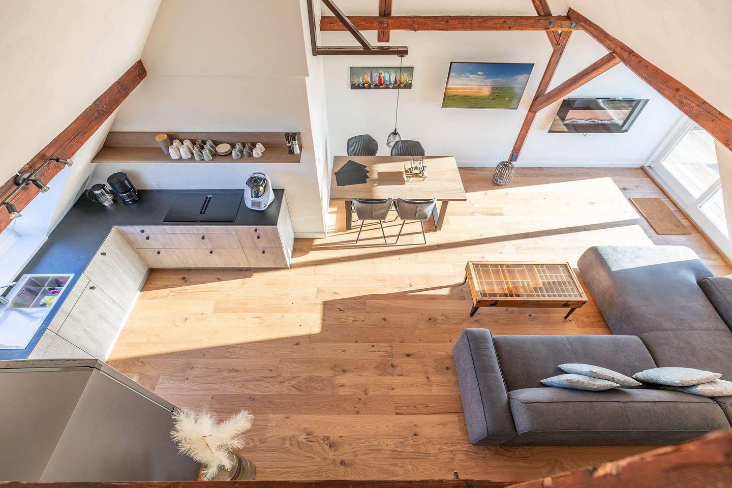 Die offene Küche ist mit Induktionsherd, Backofen, Geschirrspülmaschine, Kühl- und Gefrierschrank, Qbo Essential und Thermomix perfekt für einen Wohlfühlurlaub eingerichtet. Der gesamte Wohnbereich wird über eine Fußbodenheizung erwärmt.