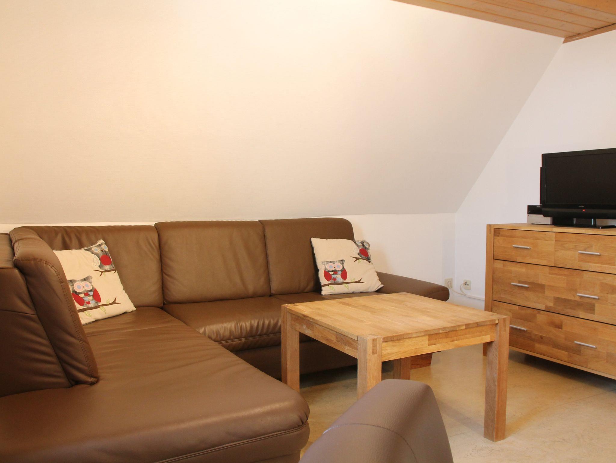 Im Wohnzimmer steht eine gemütliche Sofaecke mit TV.
