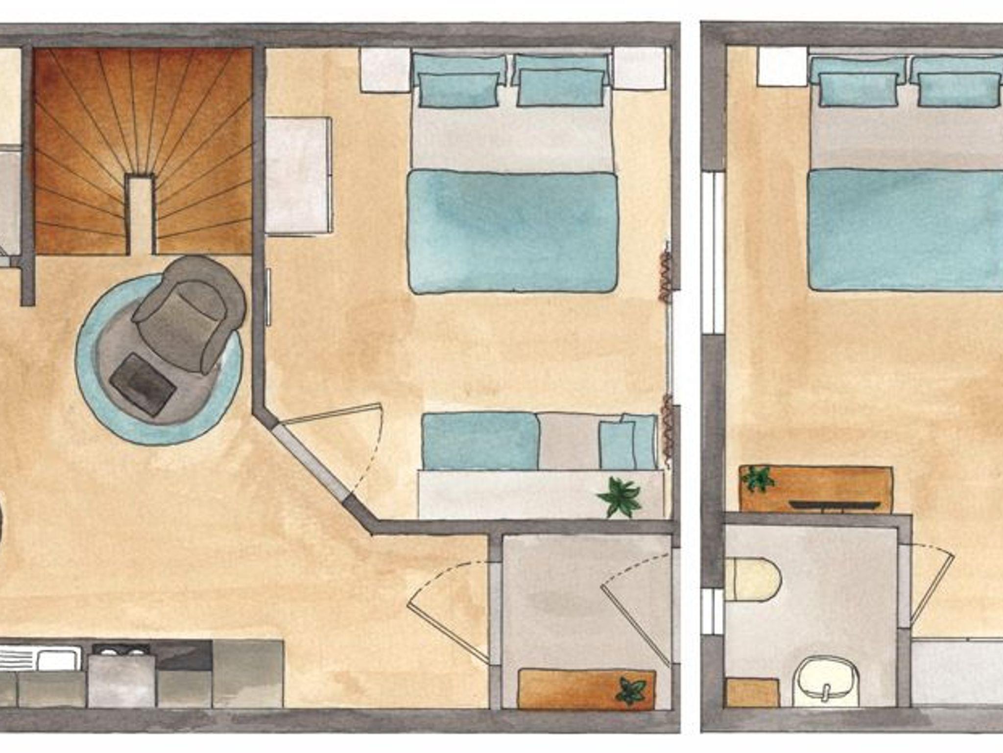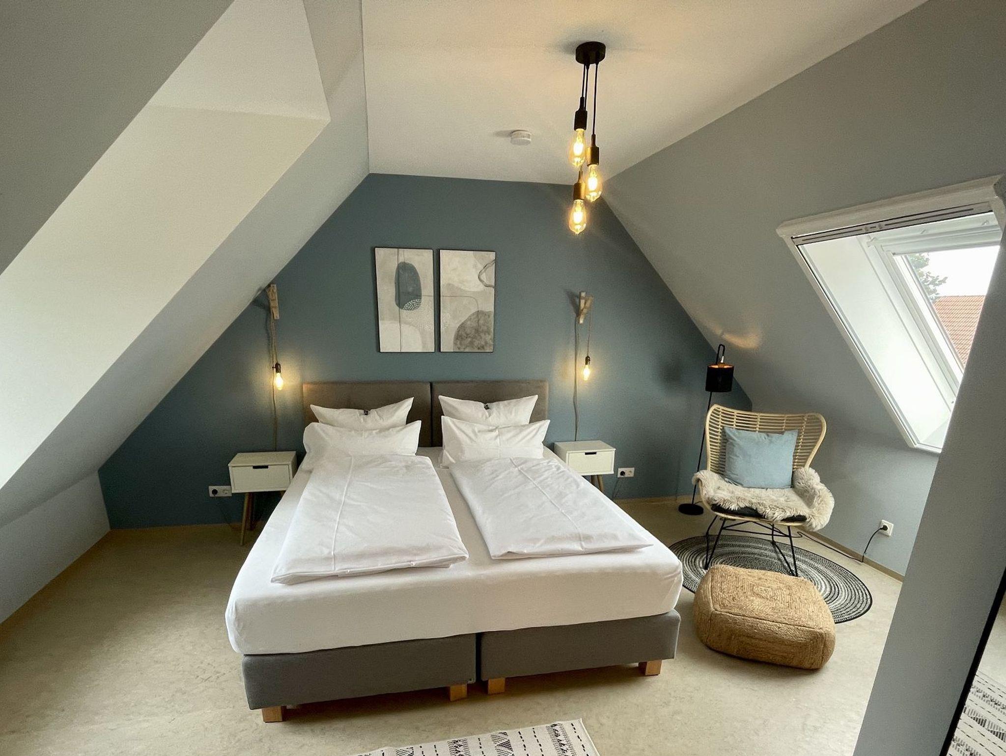 Im Schlafzimmer im Erdgeschoss findet ihr ein gemütliches Boxspringbett und ein modernes Schrankbett. Das Schlafzimmer im Obergeschoss verfügt neben einem weiteren Boxspringbett auch über ein eigenes angrenzendes WC.