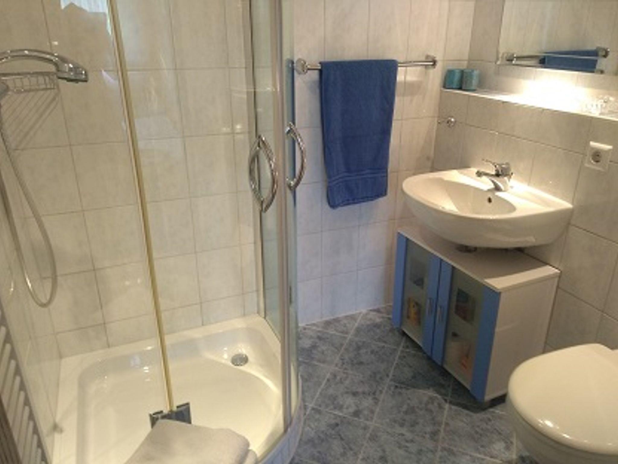 Bad mit Dusche, Waschbecken und WC