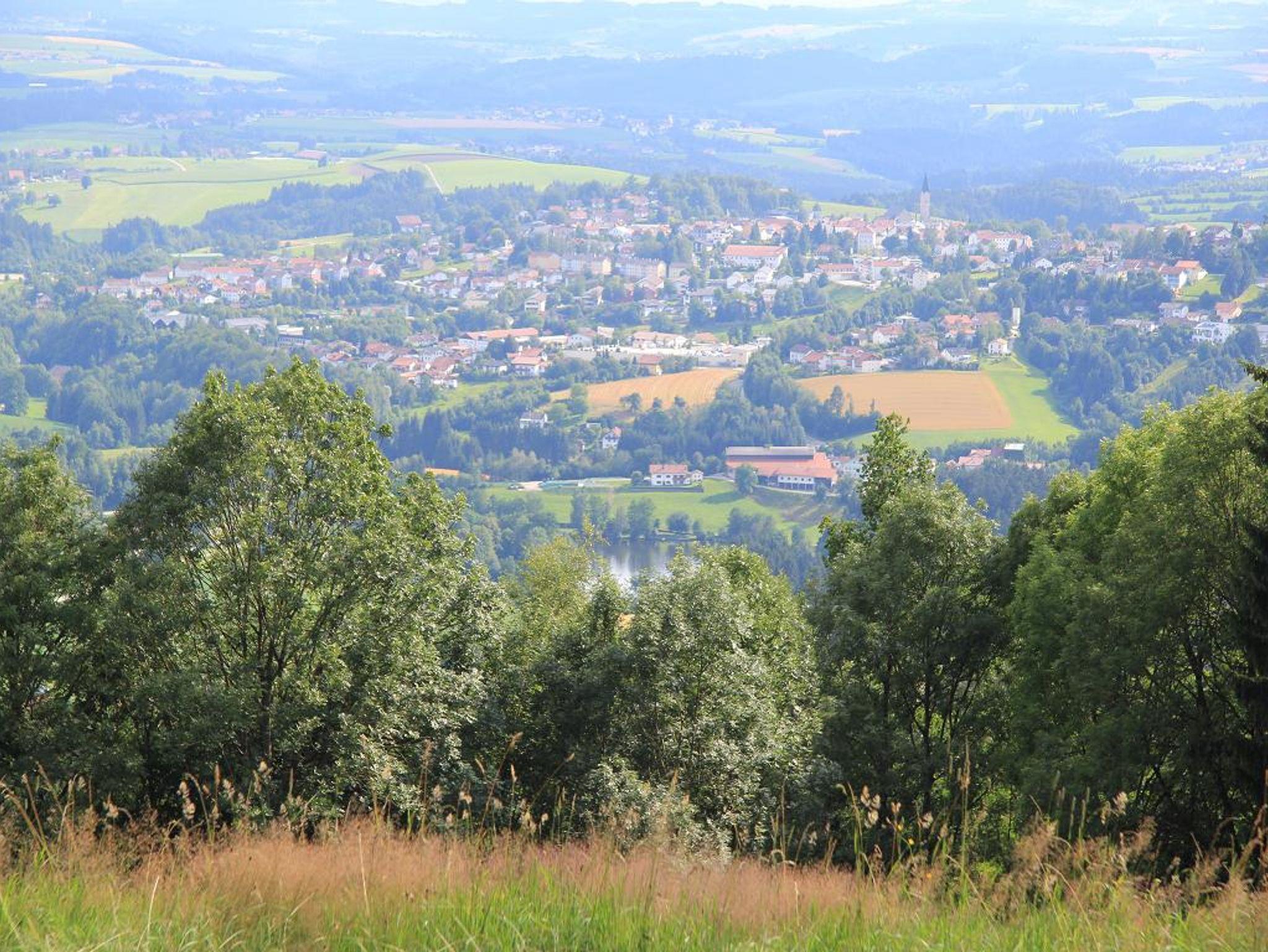 mit Blick auf den Luftkurort Hauzenberg und das Staffelbachtal. Auf der Terrasse ist für das Zimmer ein Tisch mit 2 Stühlen und separat noch eine Biertischgarnitur für die Brotzeit in der Abendsonne.
