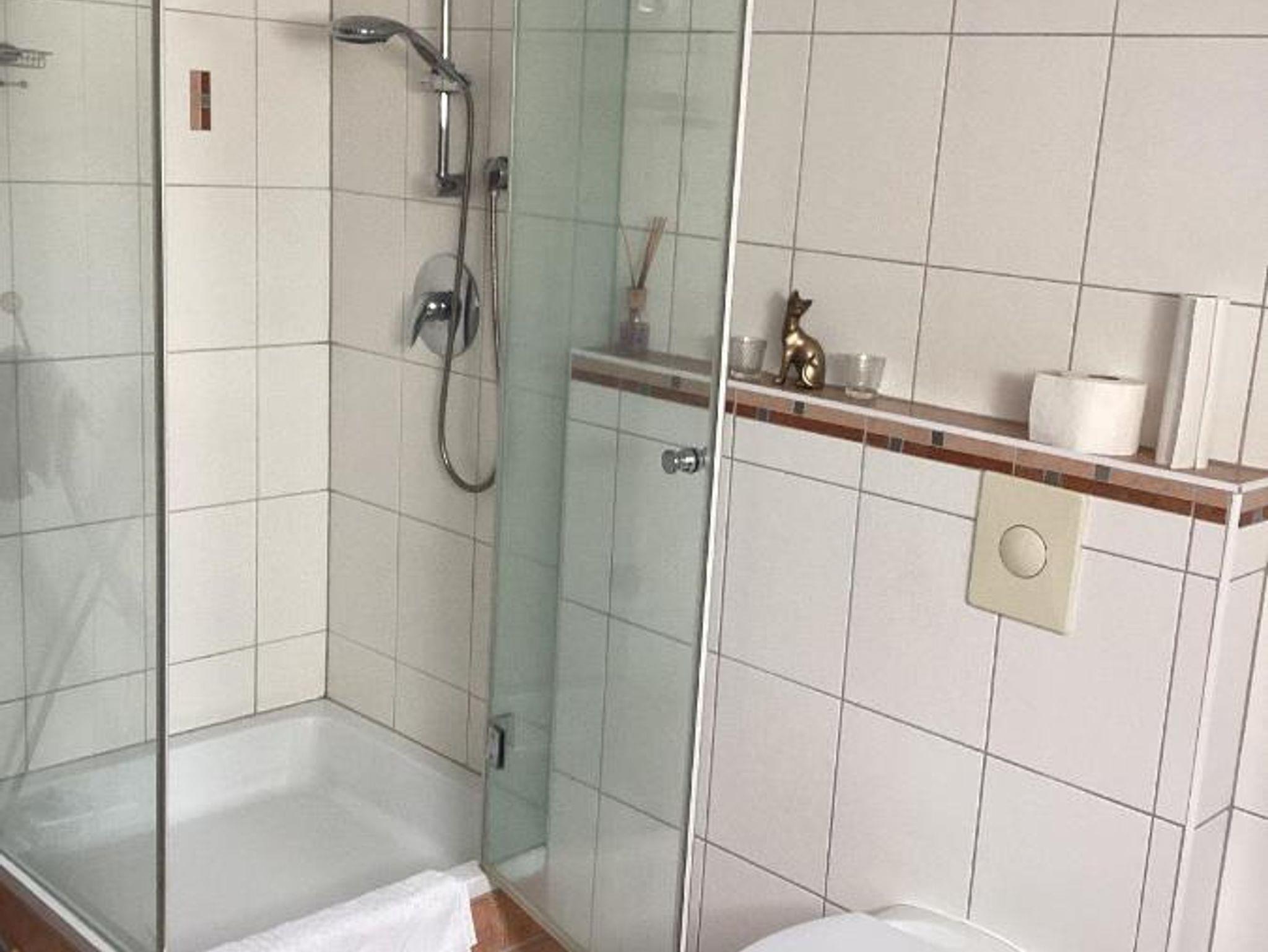Das Badezimmer verfügt über eine Dusche, ein WC, ein Waschbecken und eine Badewanne.