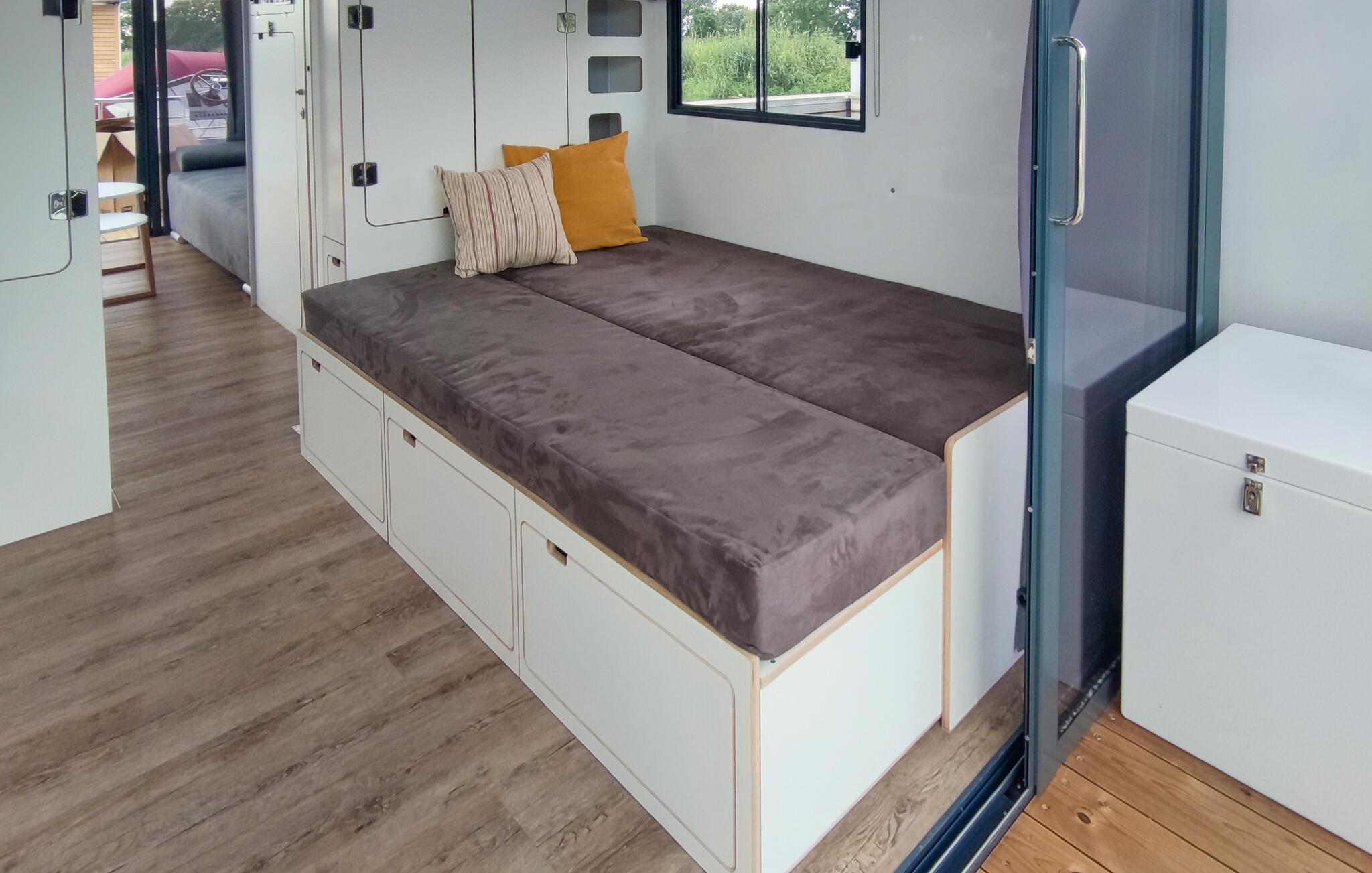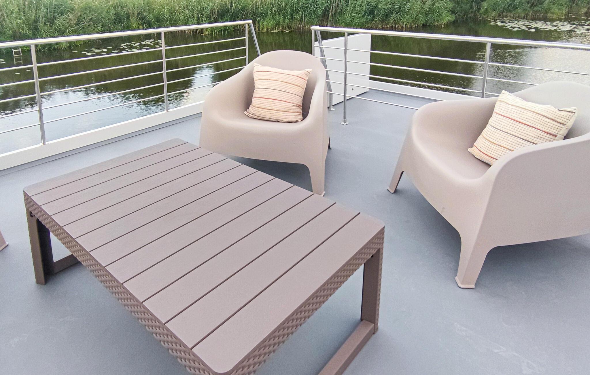 Du kan også benytte deg av husbåtens uteområde og tilbringe avslappende timer på det stilfullt møblerte soldekket med utsikt over den idylliske innsjøen. Her kan du avslutte dagen i fred og ro og se fascinerende solnedganger direkte fra vannet.
