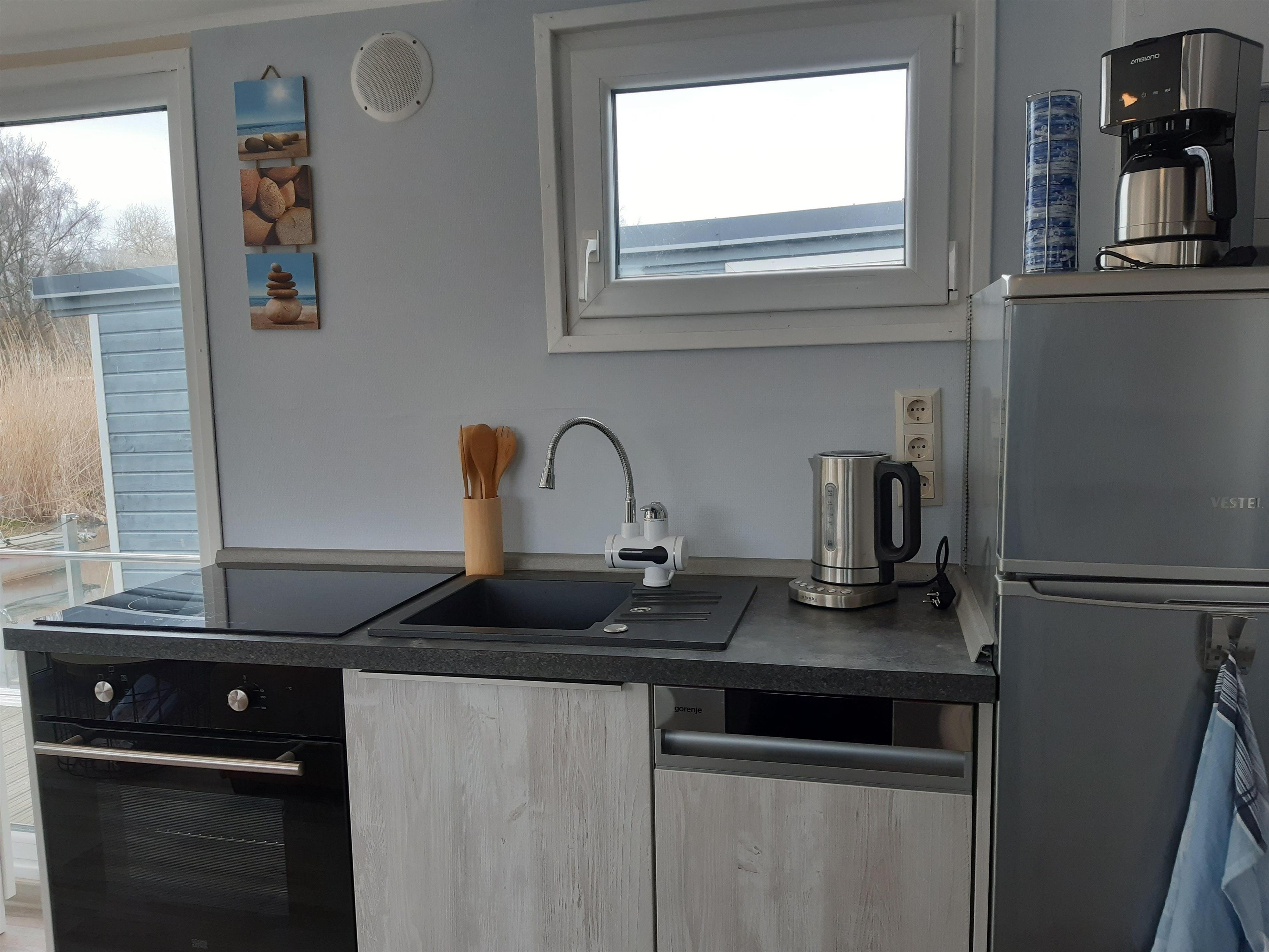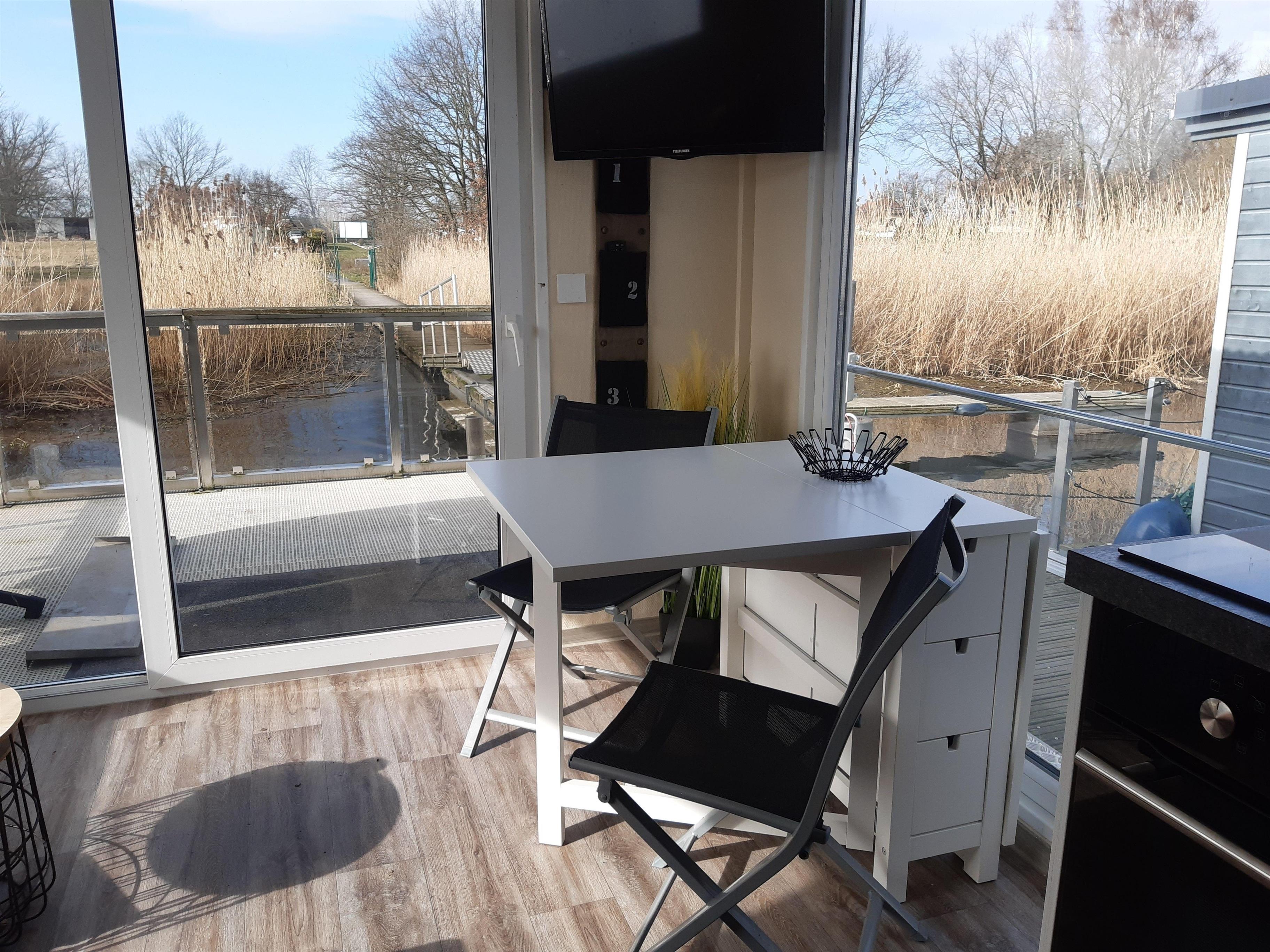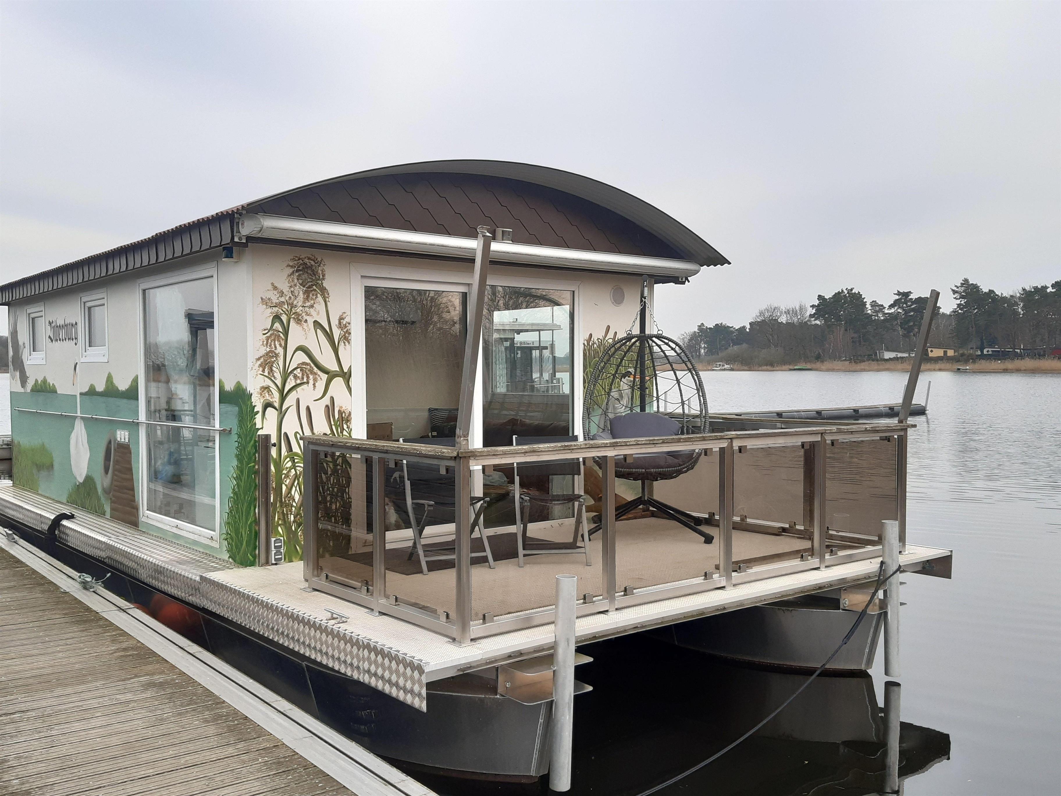 Das schwimmende Haus liegt fest verankert am Steg. Die solide und zweckmäßige Ausstattung mit viel Liebe zum Detail sorgt für erholsame Stunden im gemütlichen Ambiente. Ein kleines Schlafzimmer mit einem Doppel- und einem Hochbett sowie einem Schlafsofa im Wohnzimmer mit freiem Blick auf den See. Hier können Sie die Zeit vergessen und einfach die Natur genießen.