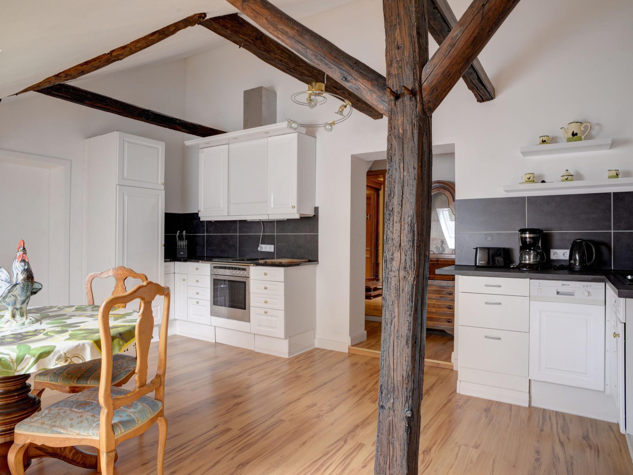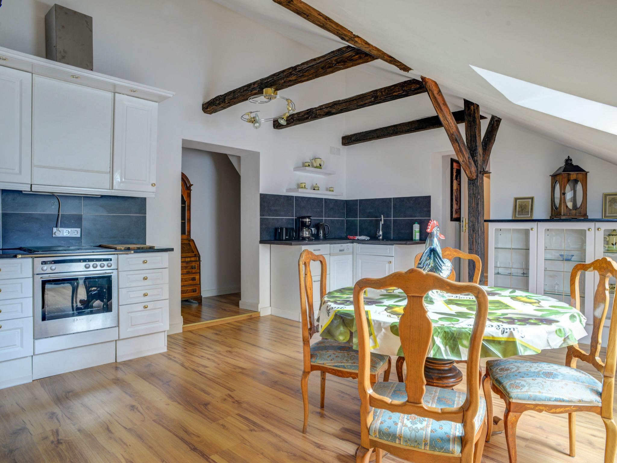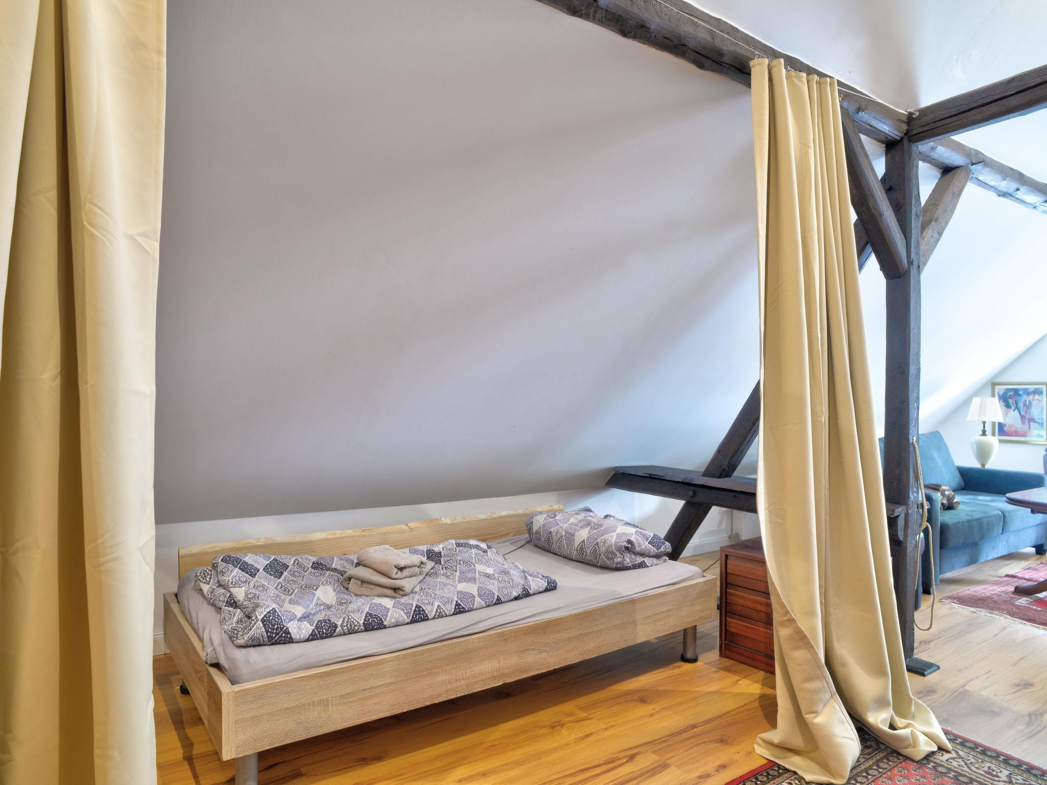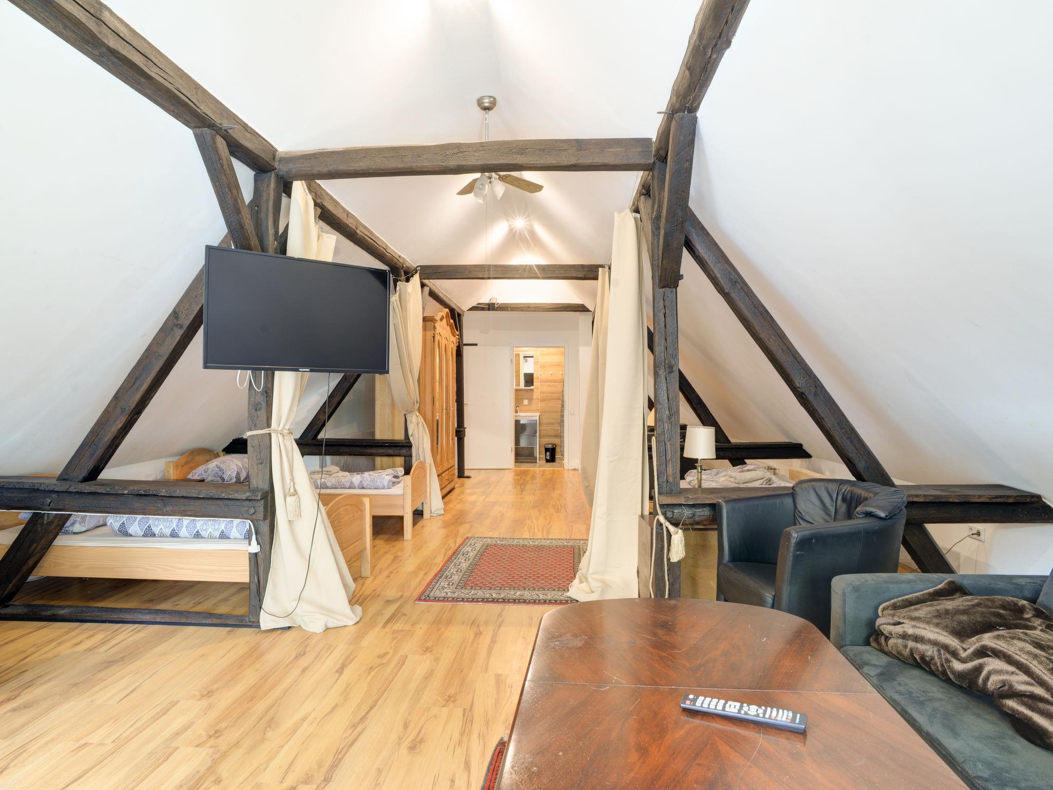 "Lounge an der Kirche", 1-room apartment 100 m2 on 1st floor. Bright, fully renovated in 2022, cosy and wooden furniture furnishings: living/sleeping room with sloping ceilings with 3 beds (90 cm, length 200 cm), satellite TV (flat screen). Open kitchen (oven, 4 ceramic glass hob hotplates, kettle, freezer, electric coffee machine) with dining table. Shower/WC. Oil heating. Wooden floors. Patio. Facilities: children's high chair, baby cot. Internet (WiFi, free). Please note: non-smokers only. Maximum 1 pet/ dog allowed. Smoke alarm, fire extinguisher.