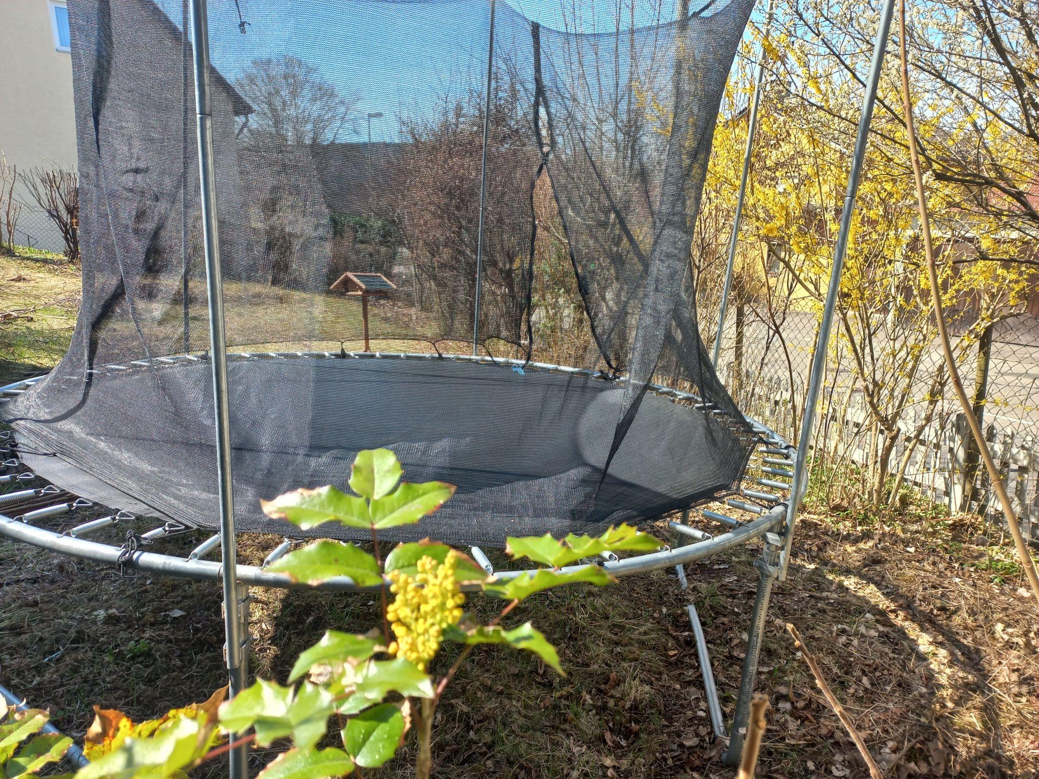 In the garden there is a large trampoline for children.