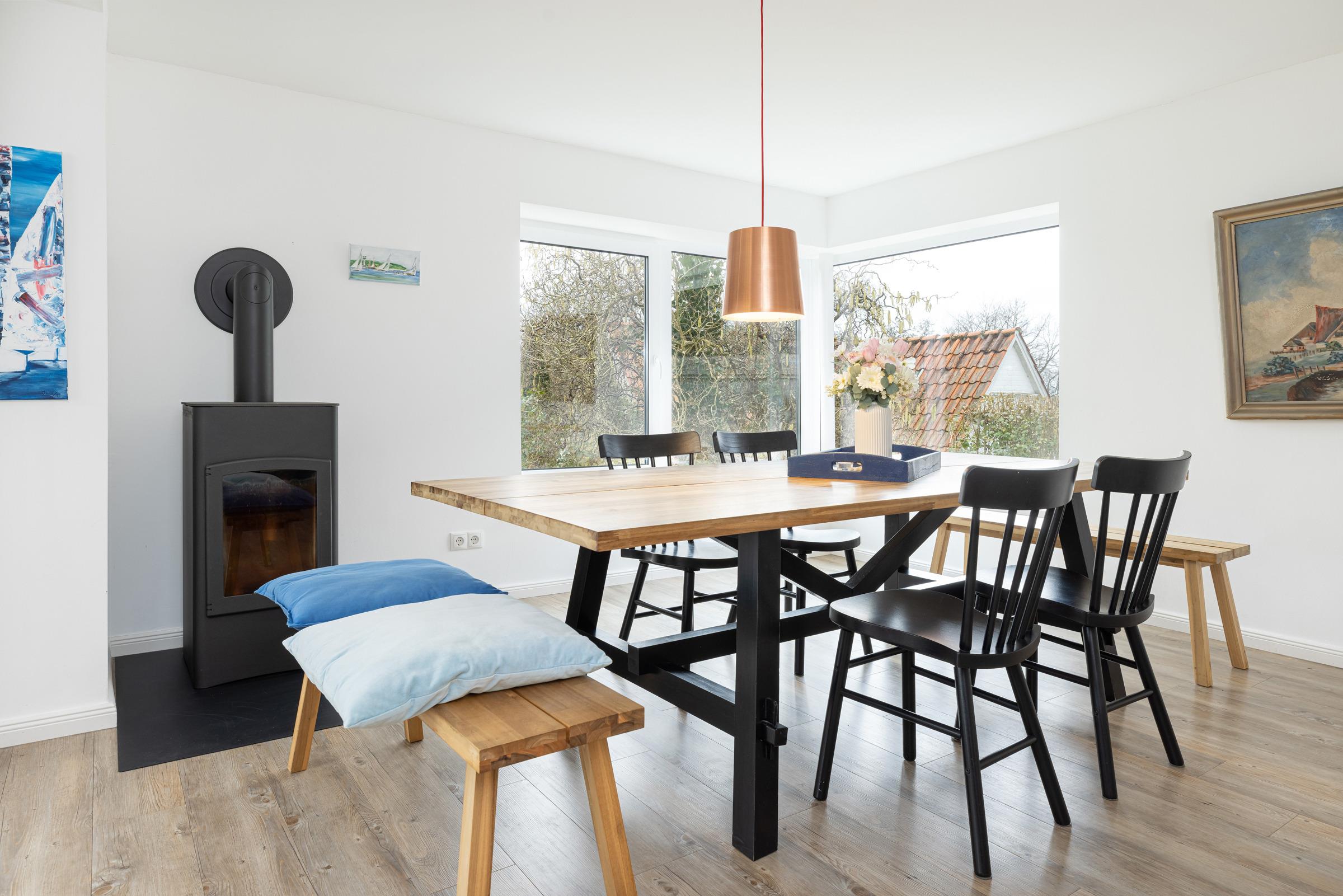 Im Erdgeschoss ist die geräumige, voll ausgestattete Wohnküche mit großen Esstisch, weiteren Sitzgelegenheiten und direktem Zugang zur sichtgeschützten Terrasse und dem großen Garten. Im angrenzenden Wohnzimmer mit Schlafcouch haben Sie ausreichend Platz für kuschelige Stunden vor dem Fernseher. Auch vom Wohnzimmer gelangen Sie auf die Terrasse und in den Garten. Für gemeinsame Grillabende steht Ihnen ein Holzkohlegrill zur Verfügung. Im gesamten Erdgeschoß genießen Sie die Wärme durch eine Fußbodenheizung.