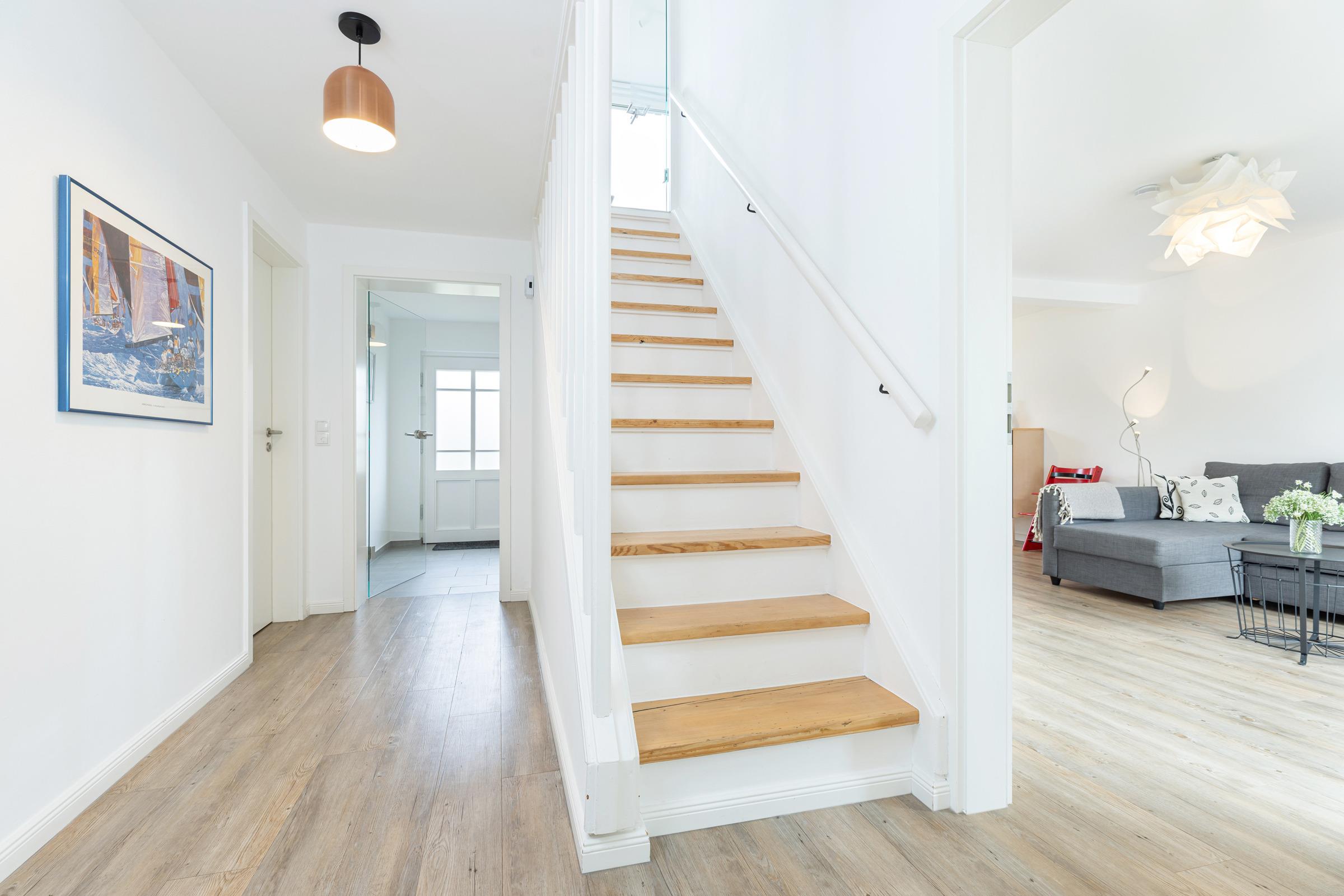 In der ersten Etage sind zwei separate Schlafzimmer. Ein Schlafzimmer mit Doppelbett (160x200 cm) sowie ein weiteres Schlafzimmer mit einer Schlafcouch (160x200 cm) und einem Einbauschrank. Sie haben die Wahl, auf beiden Etagen befindet sich ein modernes Duschbad mit Tageslicht. Ein Arbeitsplatz mit Internetanschluss ist in der Gaube des geräumigen Flurs im Obergeschoss gegeben.