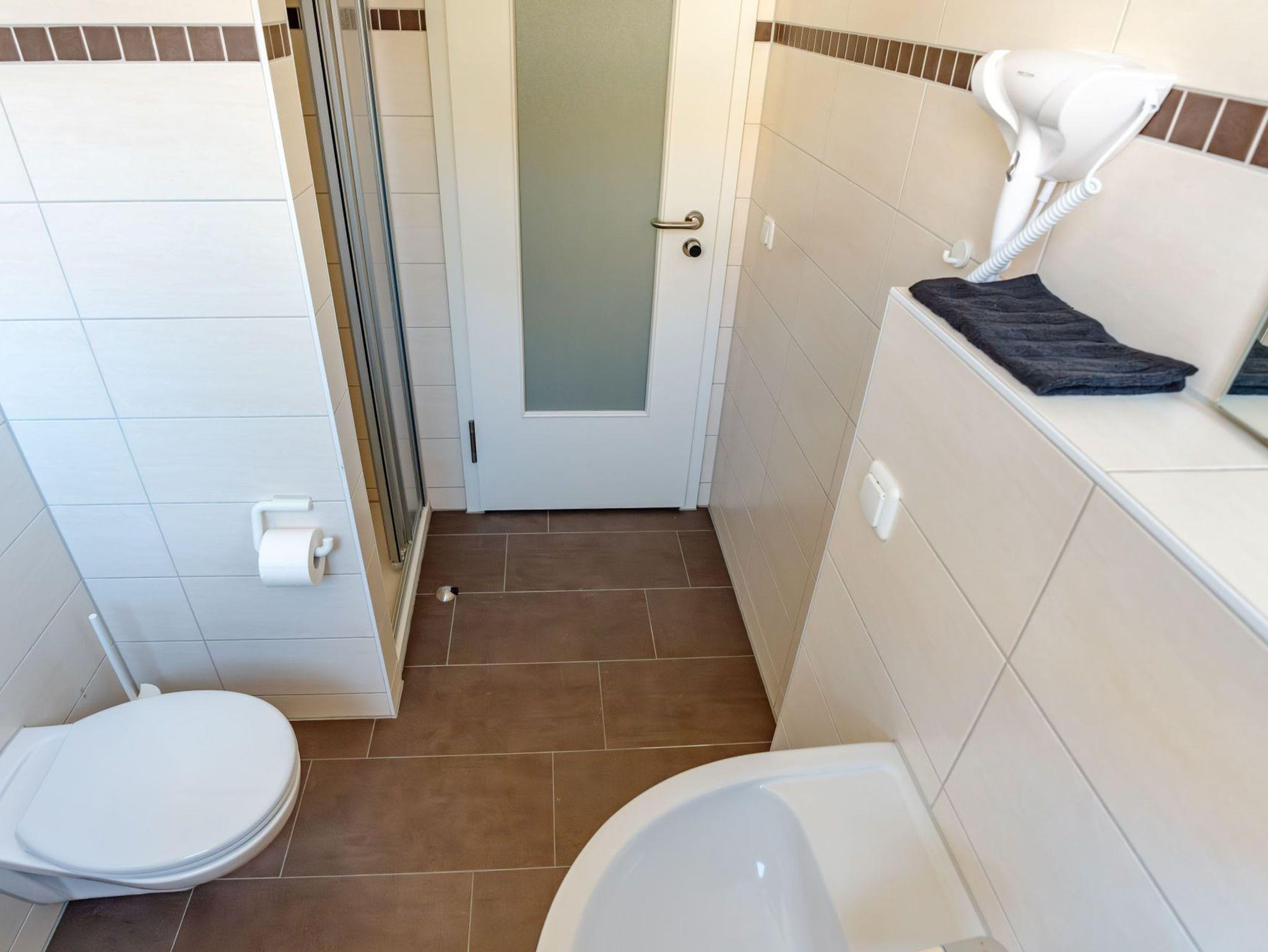 Das Badezimmer mit WC und Dusche befindet sich gegenüber und ist vom Flur aus zugänglich.