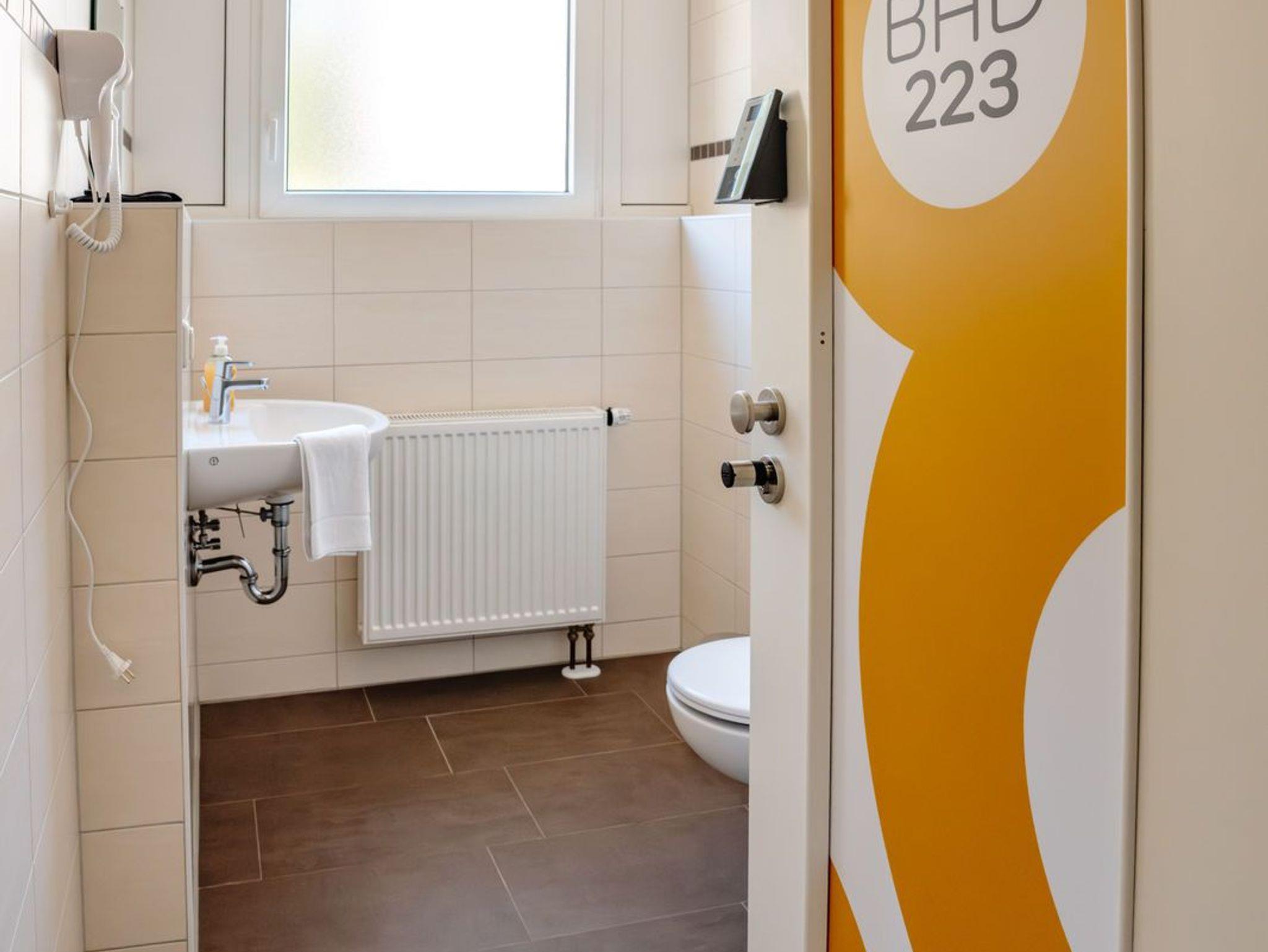 Das eigene Badezimmer mit WC und Dusche befindet sich gegenüber und ist vom Flur zugänglich.
