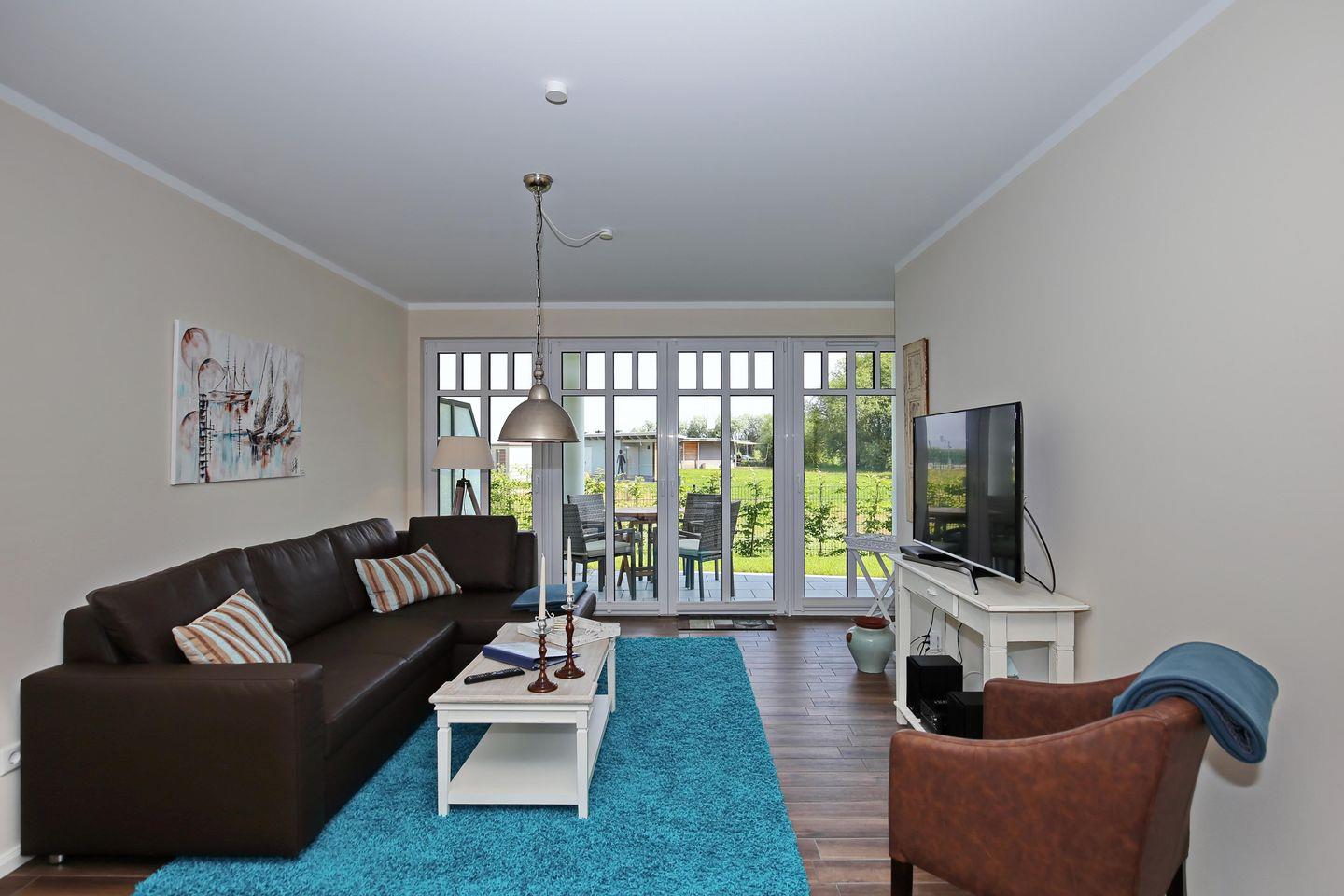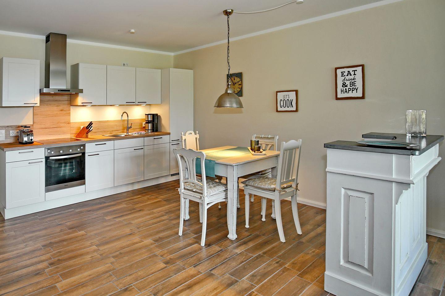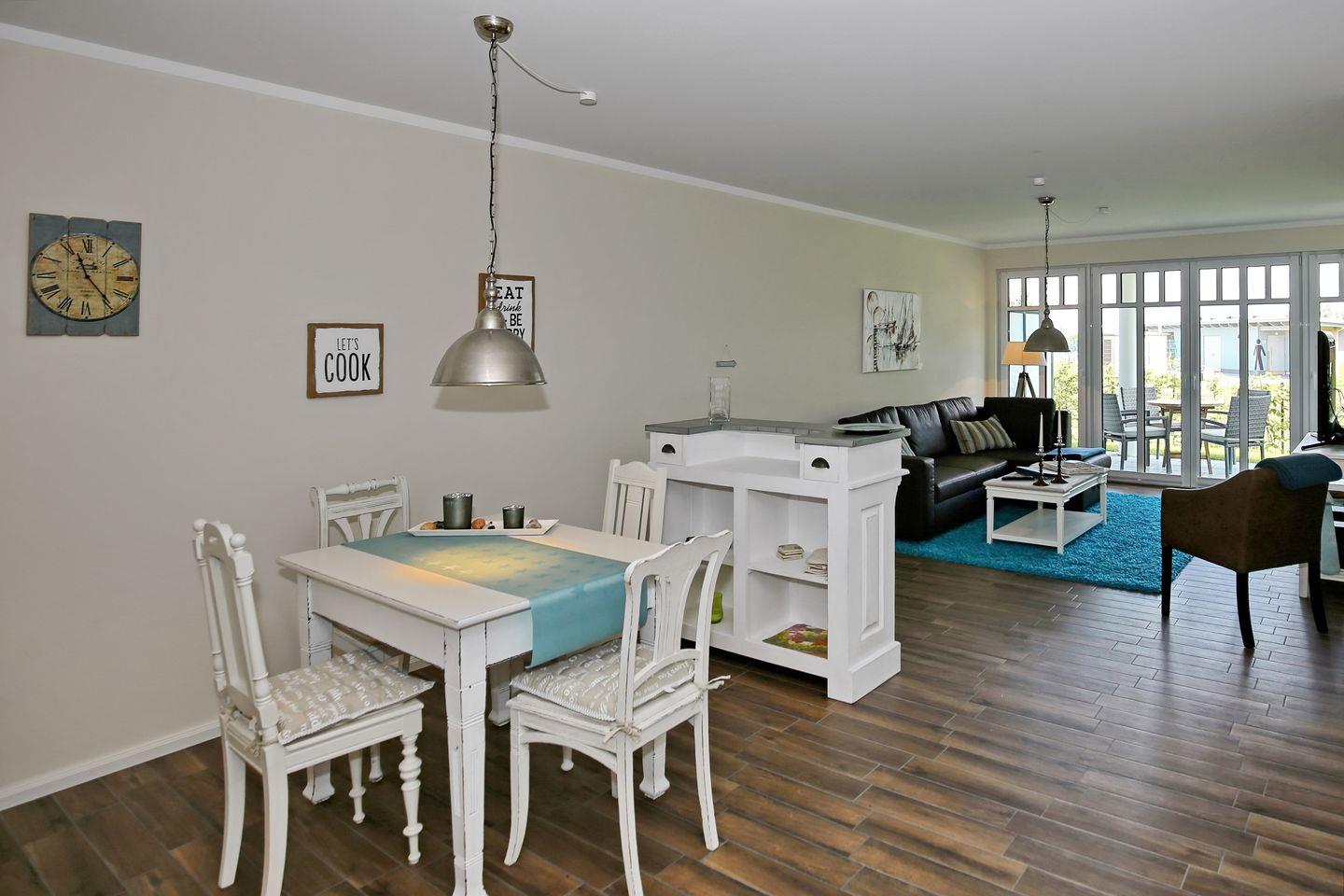 Der Wohnbereich der Ferienwohnung ist mit einer gemütlichen Couchgarnitur, einem Flatscreen-TV, einer Stereoanlage und einem Blu-Ray-Player eingerichtet. Genießen Sie hier gesellige Abende. In das WLAN des Hauses können Sie sich kostenlos einloggen. Der integrierte Essbereich bietet Ihnen viel Platz für gemeinsame Mahlzeiten.