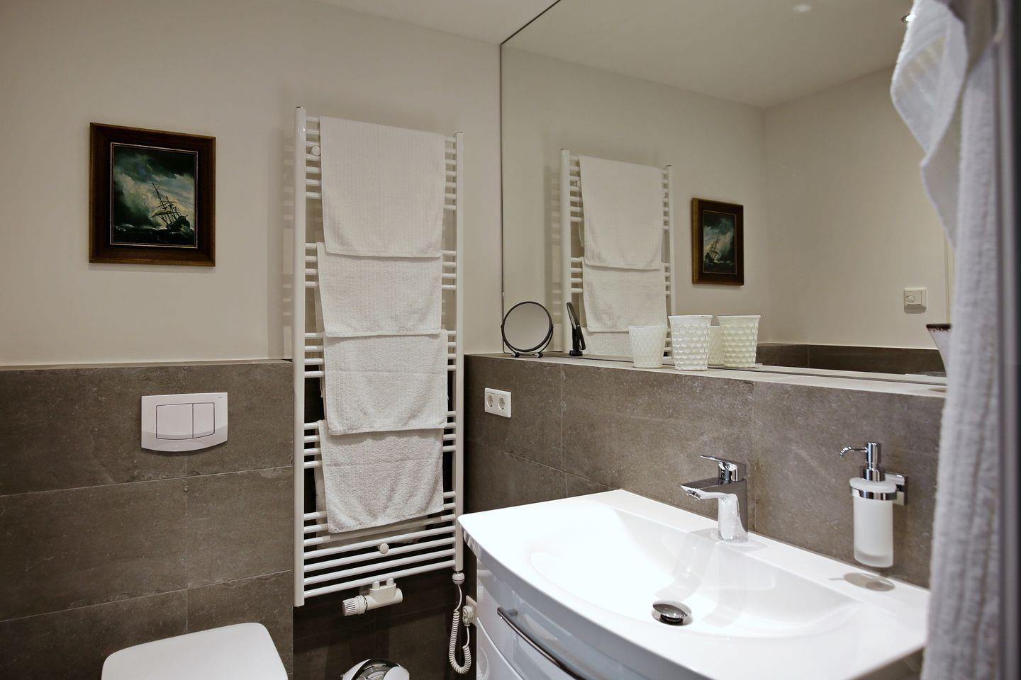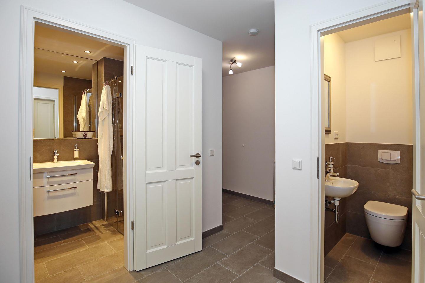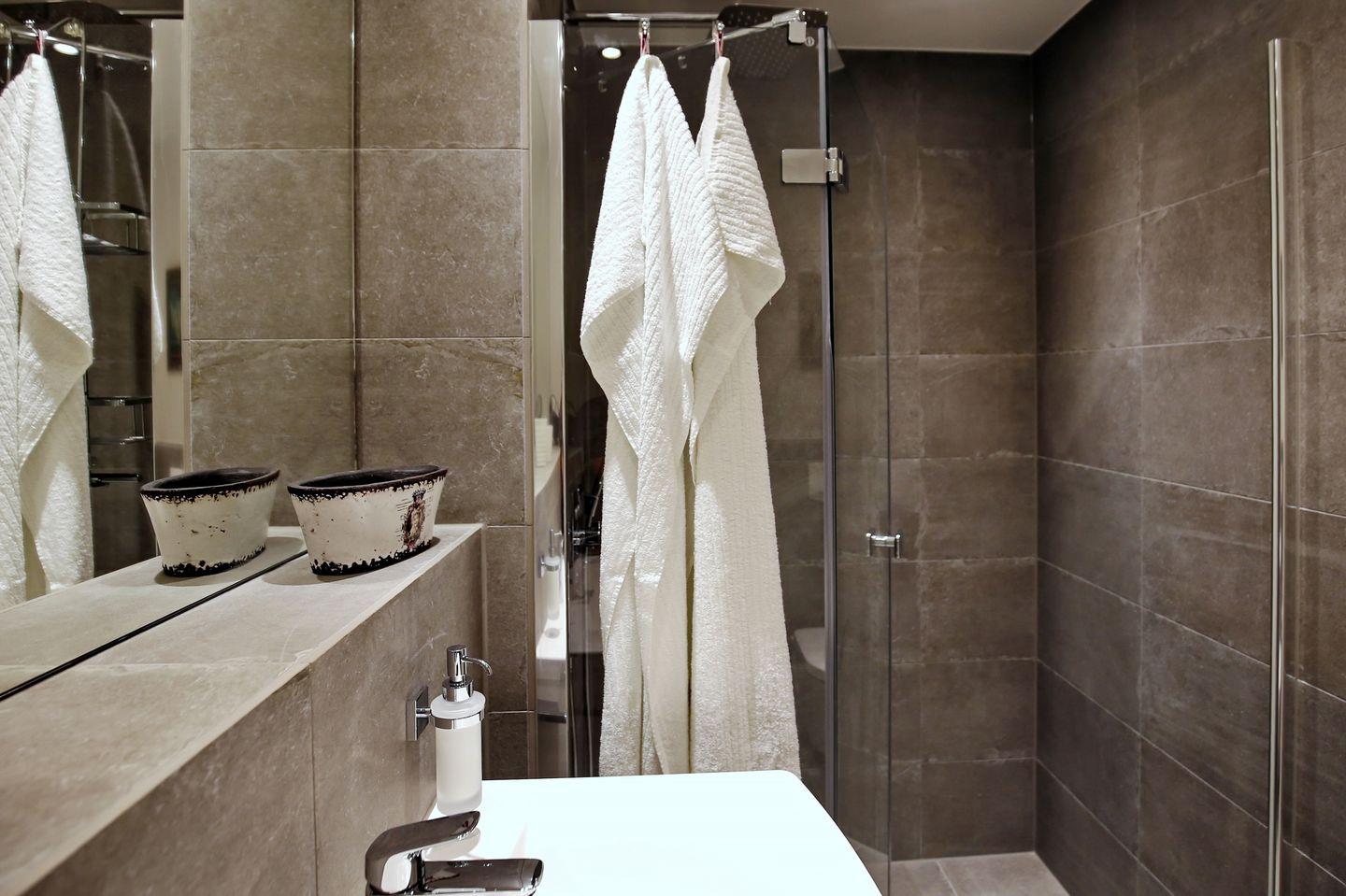 Das exklusive Duschbad verfügt über eine ebenerdige, geräumige Dusche. Der exklusive Waschtisch aus Mineralguss besitzt einen Unterschrank, in welchem Sie einen Föhn vorfinden und gleichzeitig Ihre Waschutensilien verstauen können. Zudem ist ein wandbreiter, deckenhoher Spiegel installiert.