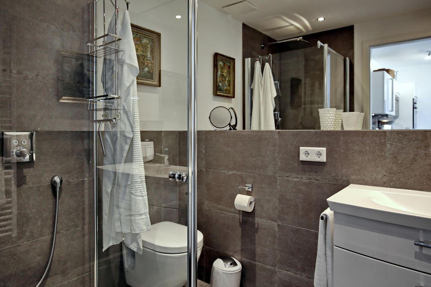 Im modernen Duschbad finden Sie eine ebenerdige Dusche, einen wandgroßen Spiegel und deckenintegrierte Spotlights vor. Der Waschtisch aus Mineralguss besitzt einen Unterschrank, in dem ein Föhn für Sie bereit liegt und in dem Sie gleichzeitig Ihre Sachen verstauen können.
