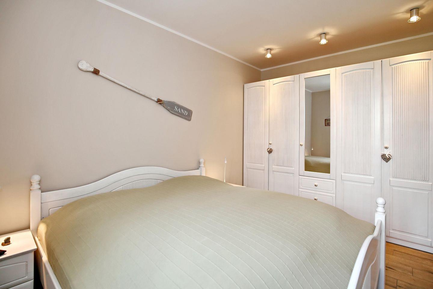 Im Schlafzimmer lädt ein komfortables Doppelbett mit zwei Matratzen (90 cm x 200 cm) zum erholsamen Schlaf ein. Der große Kleiderschrank bietet viel Stauraum für Ihre Sachen. Die Schlafcouch (160 x 200 cm) im Wohnbereich der Ferienwohnung wird mit wenigen Handgriffen zu einem bequemen Schlafplatz für 2 Personen. In den Schlafbereichen dienen Ihnen Plissees und Vorhänge als Sichtschutz und zum Verdunkeln.