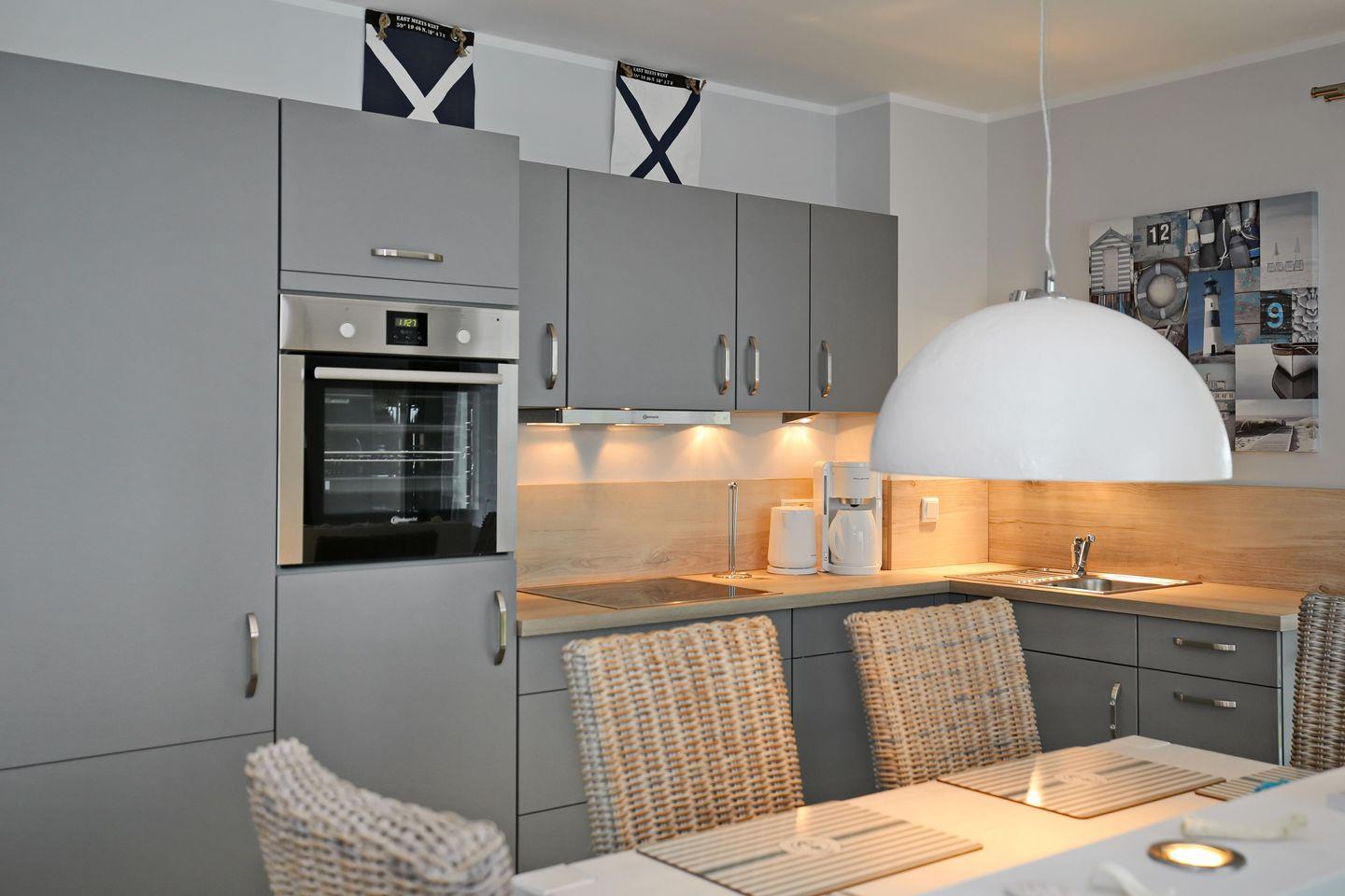 Die exklusive Küchenzeile der Ferienwohnung ist mit einem vierfachem Cerankochfeld, einem Backofen, einem Geschirrspüler sowie einem Kühlschrank mit Gefrierfach voll ausgestattet. Ein Toaster, eine Kaffeemaschine und ein Wasserkocher komplettieren die Kücheneinrichtung.