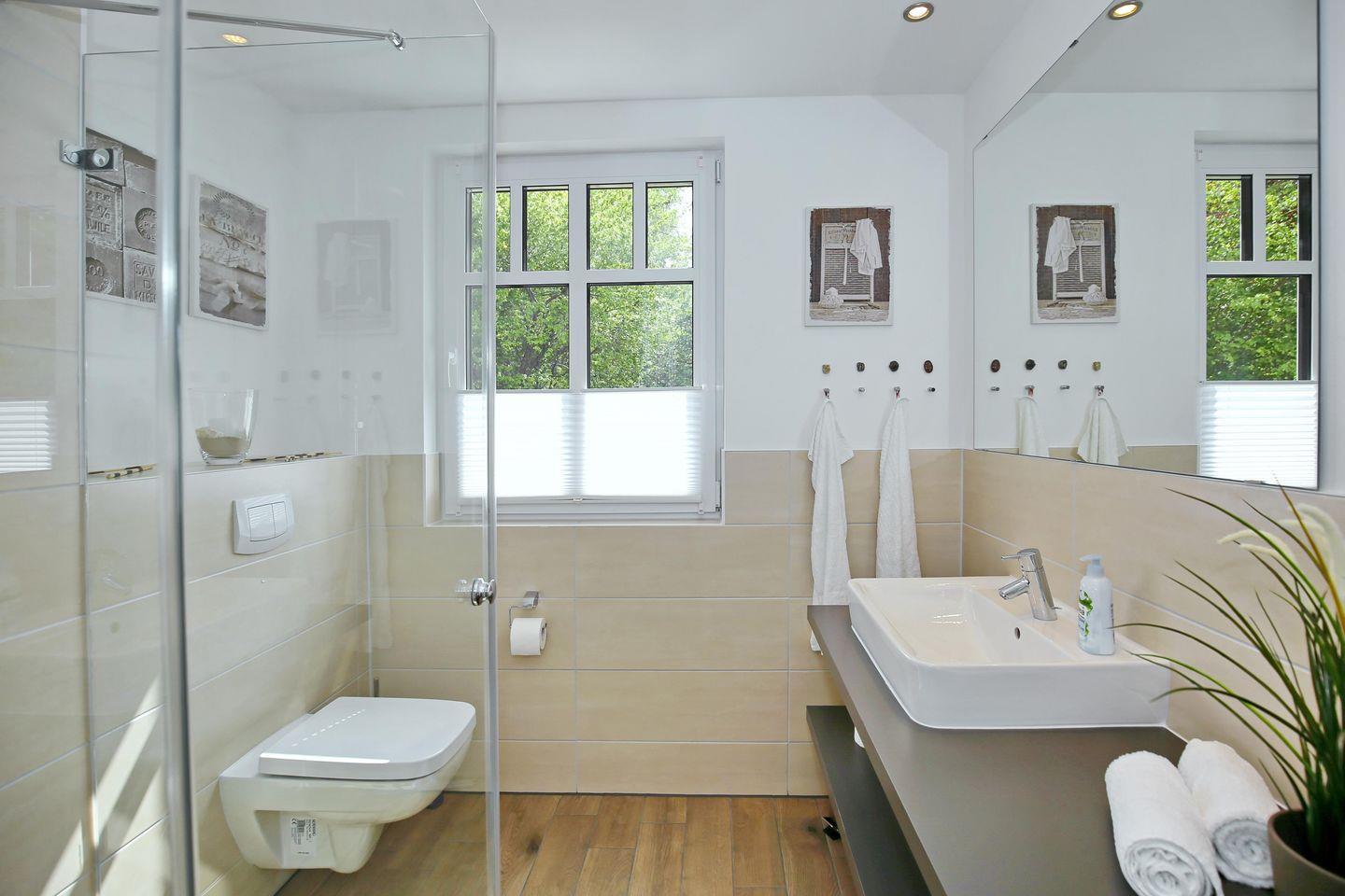 Das Duschbad mit Tageslicht und ebenerdiger Dusche ist komfortabel eingerichtet. Ein Föhn komplettiert die Ausstattung des Bades. In der Wohnung sind Bodenfliesen verlegt. Die Fußbodenheizung in allen Wohnräumen sorgt für wohlige Wärme. Es handelt sich um eine Nichtraucher-Wohnung. Haustiere sind in dieser Wohnung nicht gestattet.