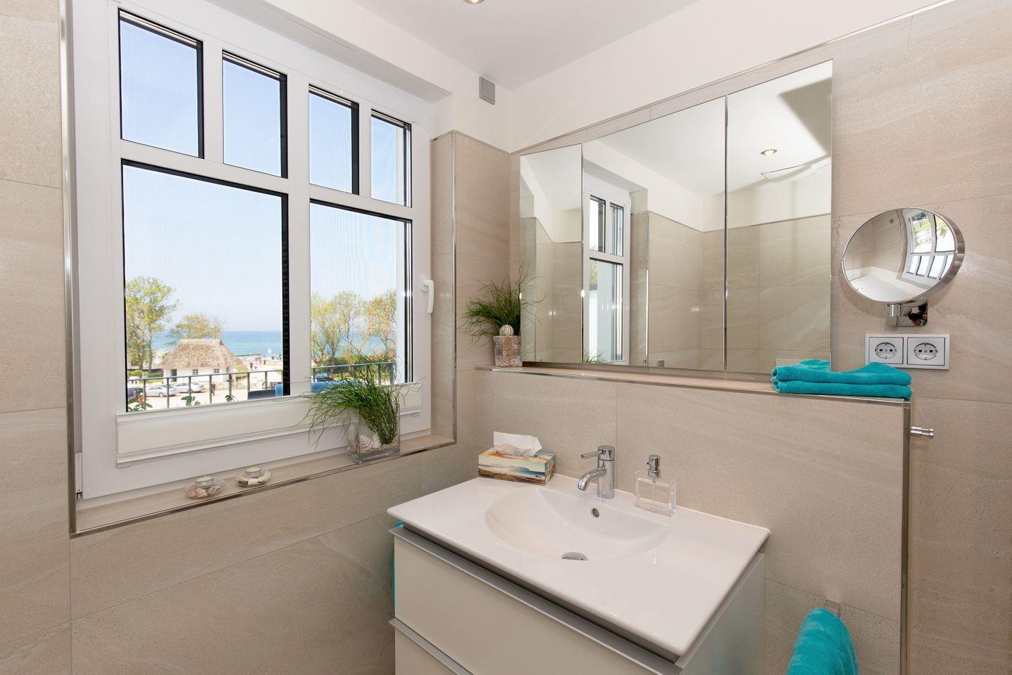 Duschbad mit Fenster und Meerblick