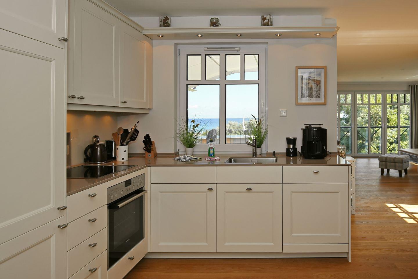 Die an den Essbereich angrenzende und exklusive Küchenzeile ist mit einem Geschirrspüler, einem Backofen, einem Toaster, einem Wasserkocher, einer Bohnenkaffeemaschine, sowie einem 4-Zonen-Induktionskochfeld und einem Kühlschrank mit Gefrierfach ausgestattet.