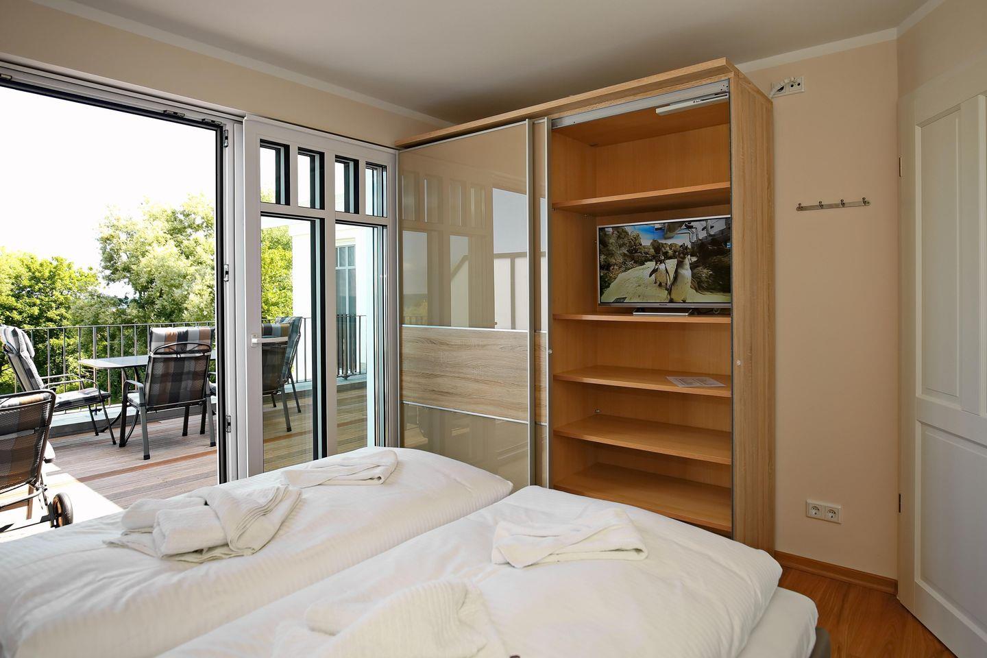 Im ersten Schlafzimmern lädt Sie ein komfortables Doppelbett mit 2 Matratzen (90 x 200 cm) und im zweiten Schlafzimmer ein Doppelbett mit 2 Matratzen (80 x 200 cm) zur erholsamen Nachtruhe ein. Ein Flachbild-TV je Schlafzimmer ergänzt die Einrichtung. Für Ihr Urlaubsgepäck bietet Ihnen der große Kleiderschrank viel Stauraum. Elektrische Rolläden dienen Ihnen in allen Räumen als Sichtschutz und zum Verdunkeln.