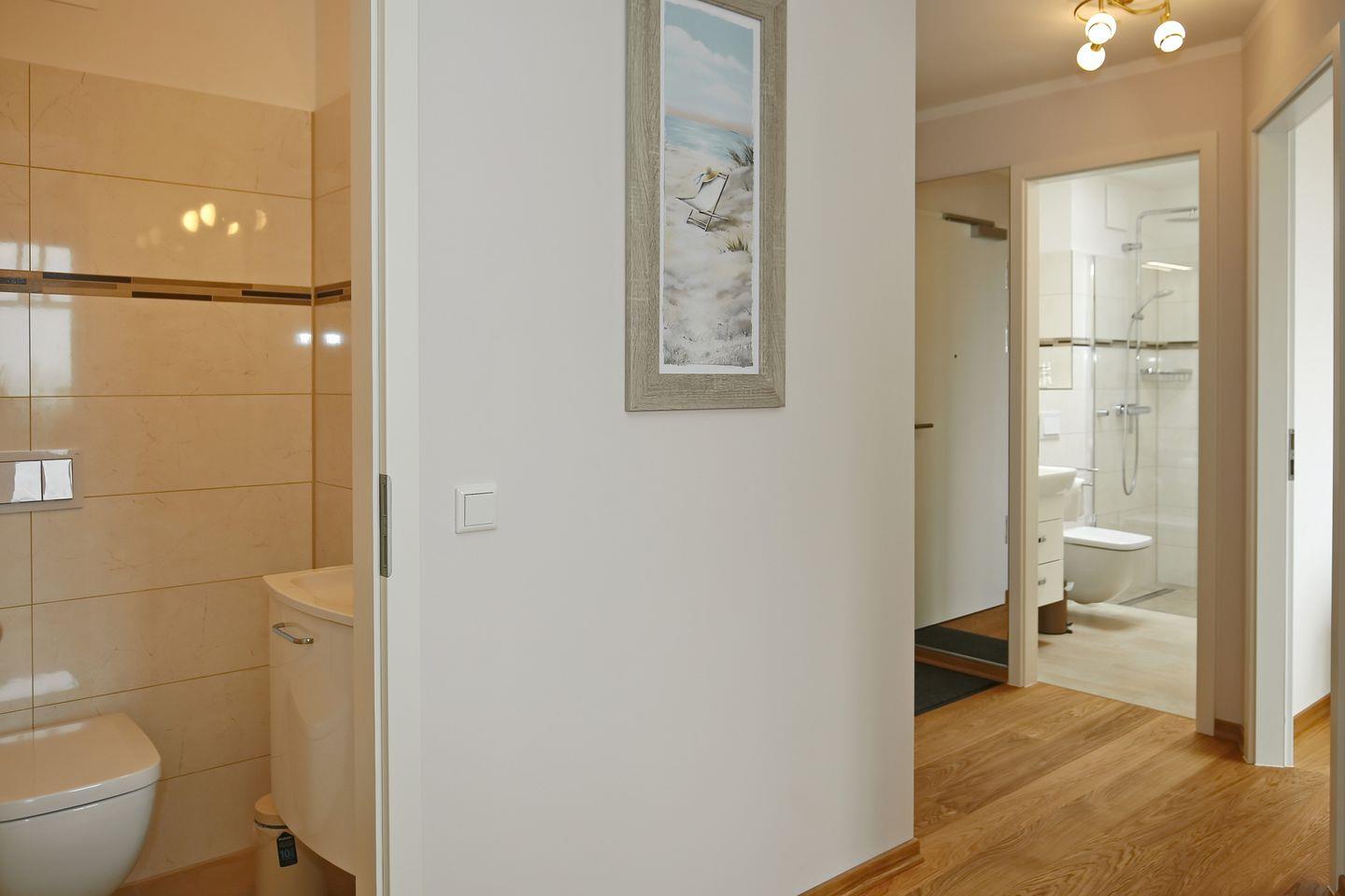 Das moderne Duschbad der Ferienwohnung (mit Tageslicht) verfügt über eine ebenerdige Dusche und einen Spiegelschrank. In der gesamten Wohnung wurde Parkett verlegt. In allen Wohnräumen sorgt die Fußbodenheizung für wohlige Wärme. Es handelt sich um eine Nichtraucher-Wohnung. Haustiere sind auf Anfrage erlaubt!